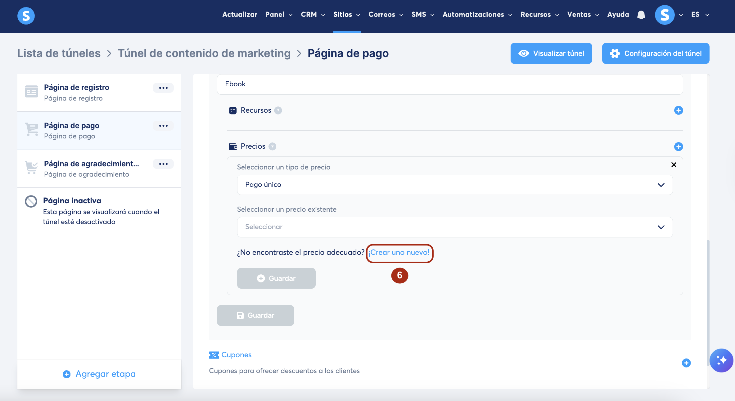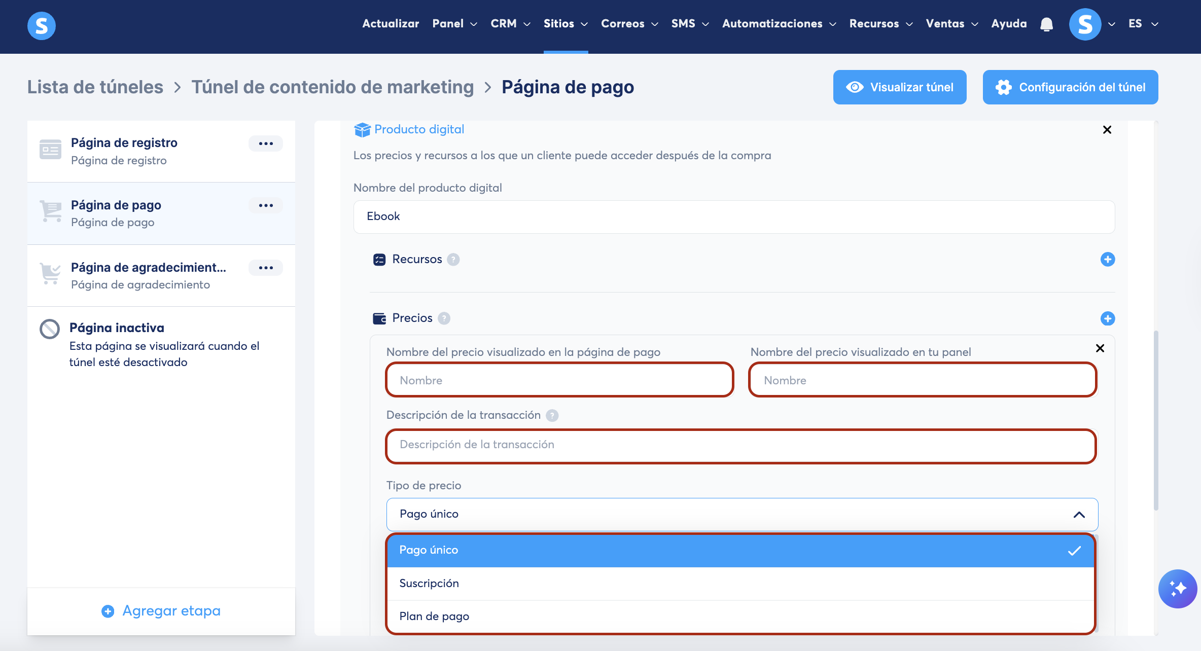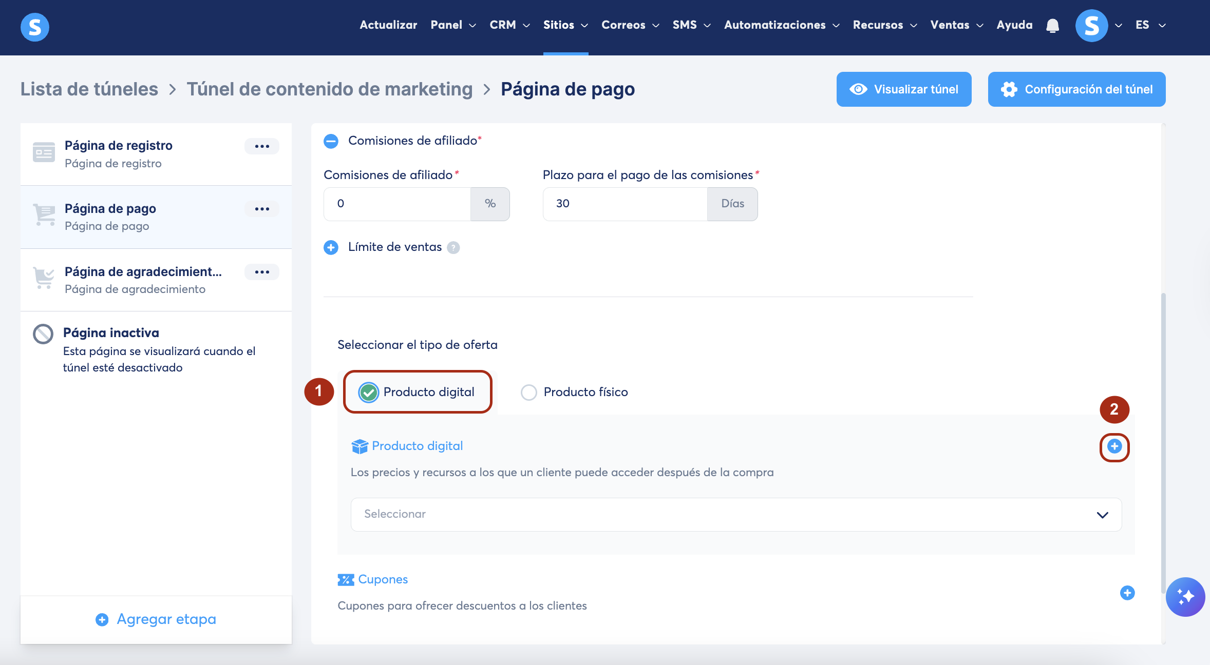 Para crear un precio para tu oferta digital, haz clic en tu página de pago. Luego selecciona Producto digital (1) entre las opciones para el tipos de oferta.