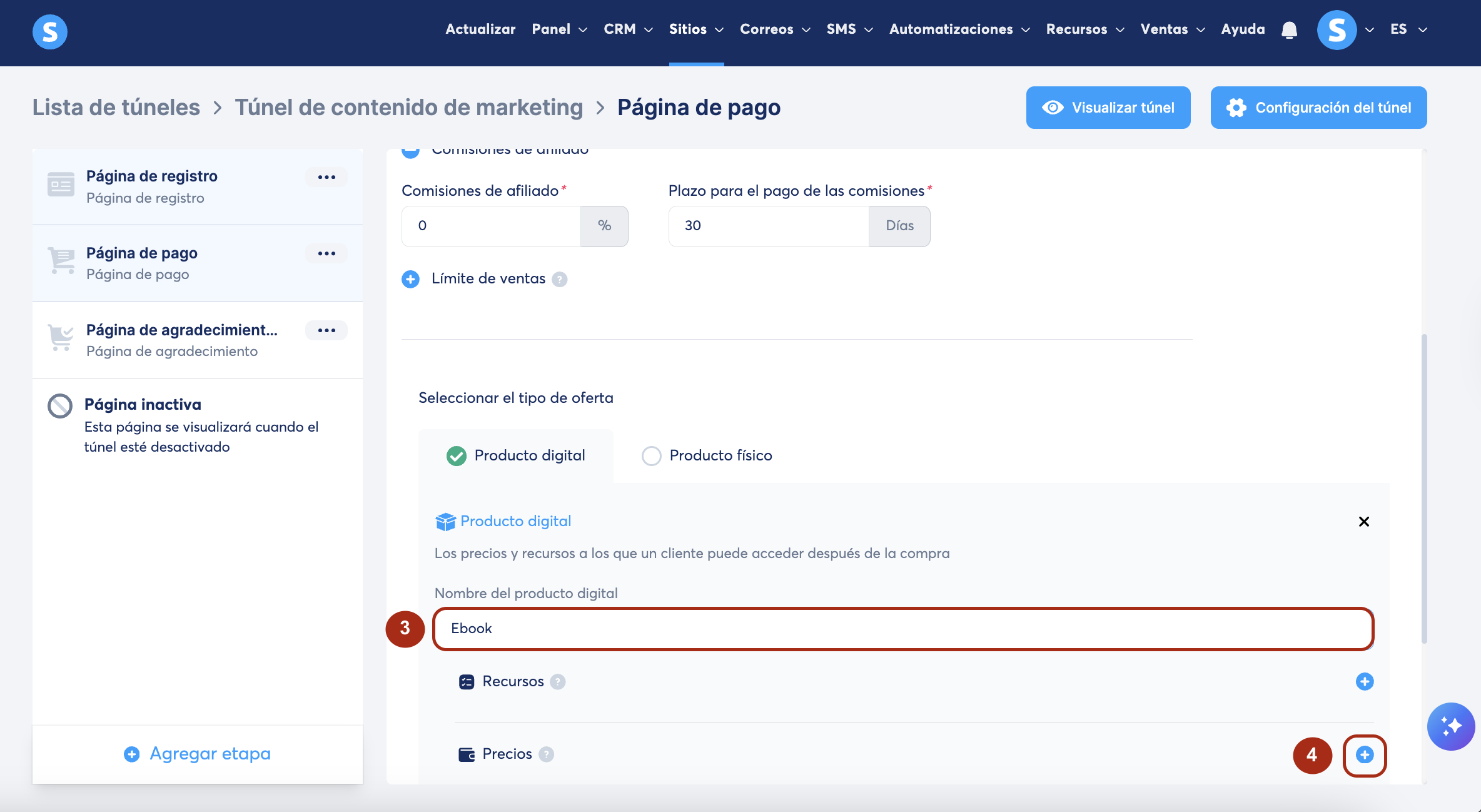 Asígnale un nombre a tu nuevo producto en el campo Nombre del producto digital (3). Luego, haz clic en el ícono (+) para configurar el precio.