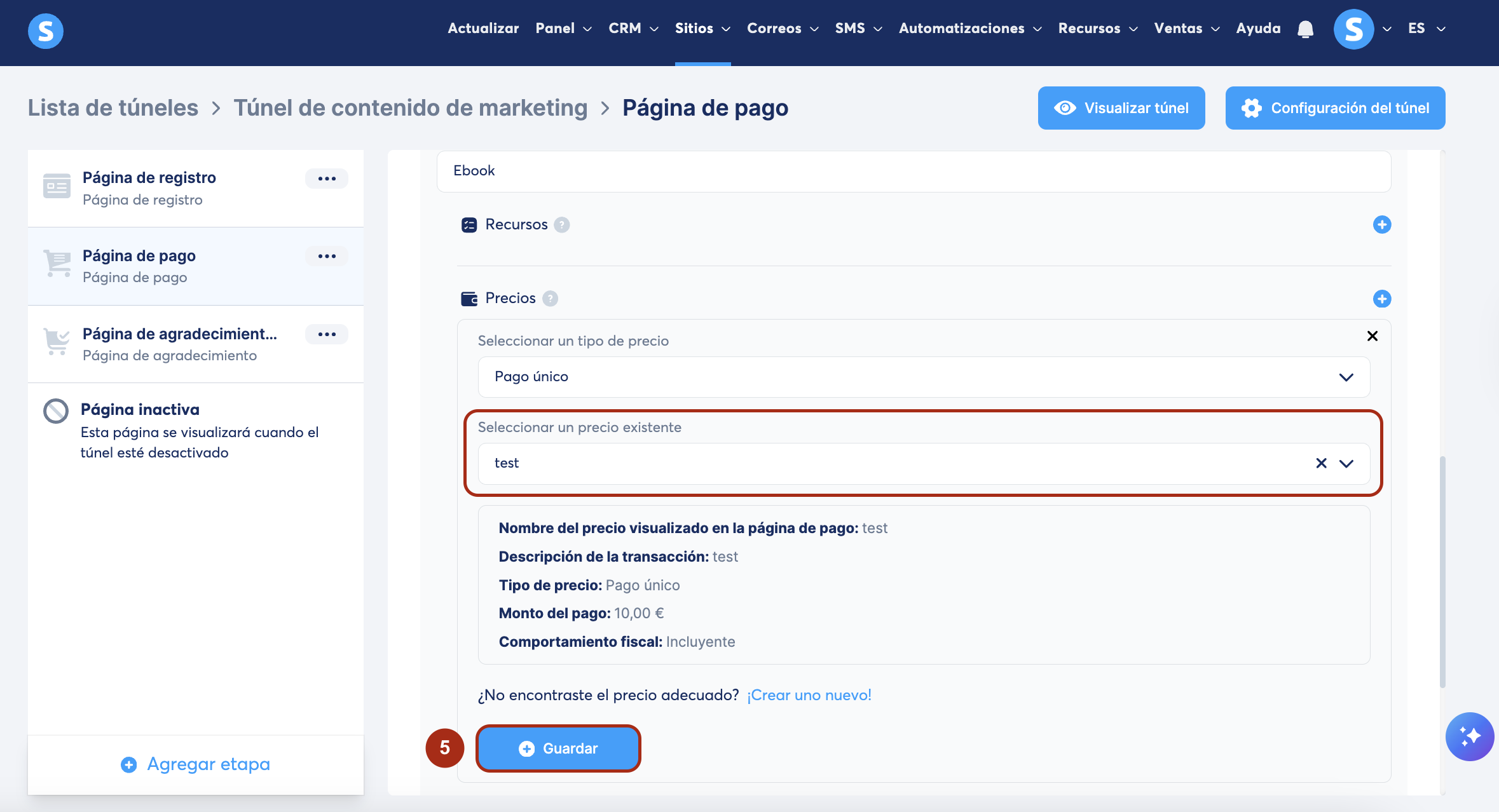 Selecciona un precio existente desde el menú desplegable y haz clic en Guardar (5).