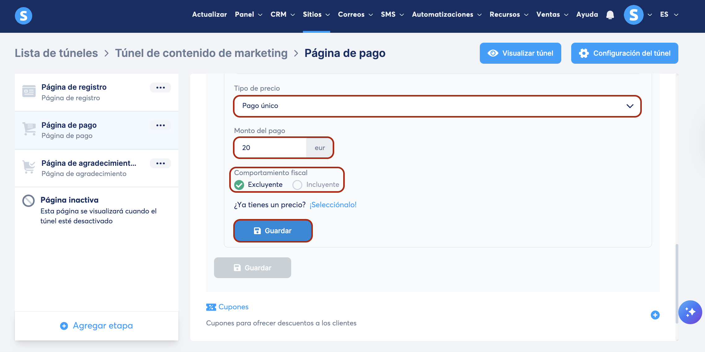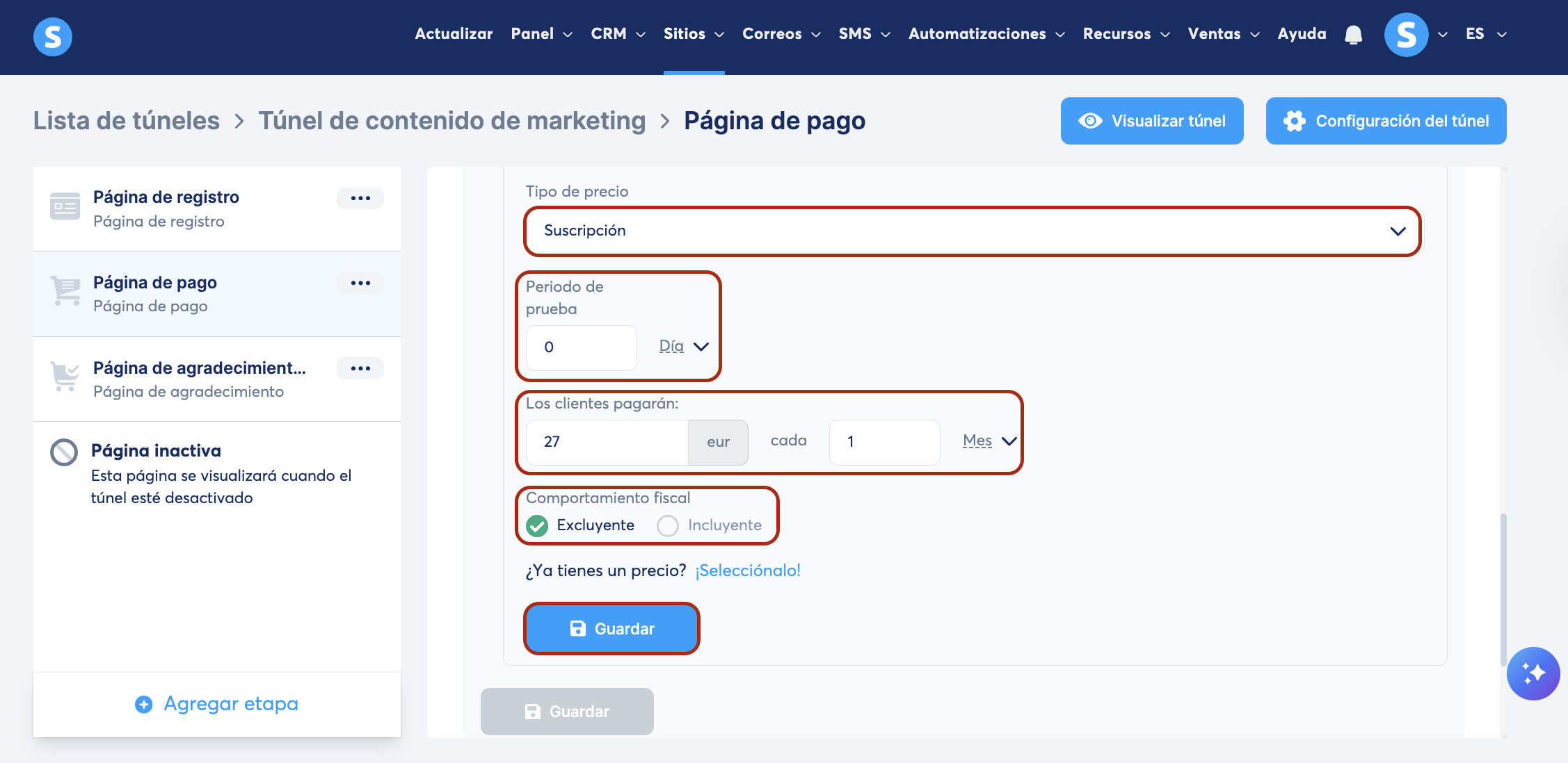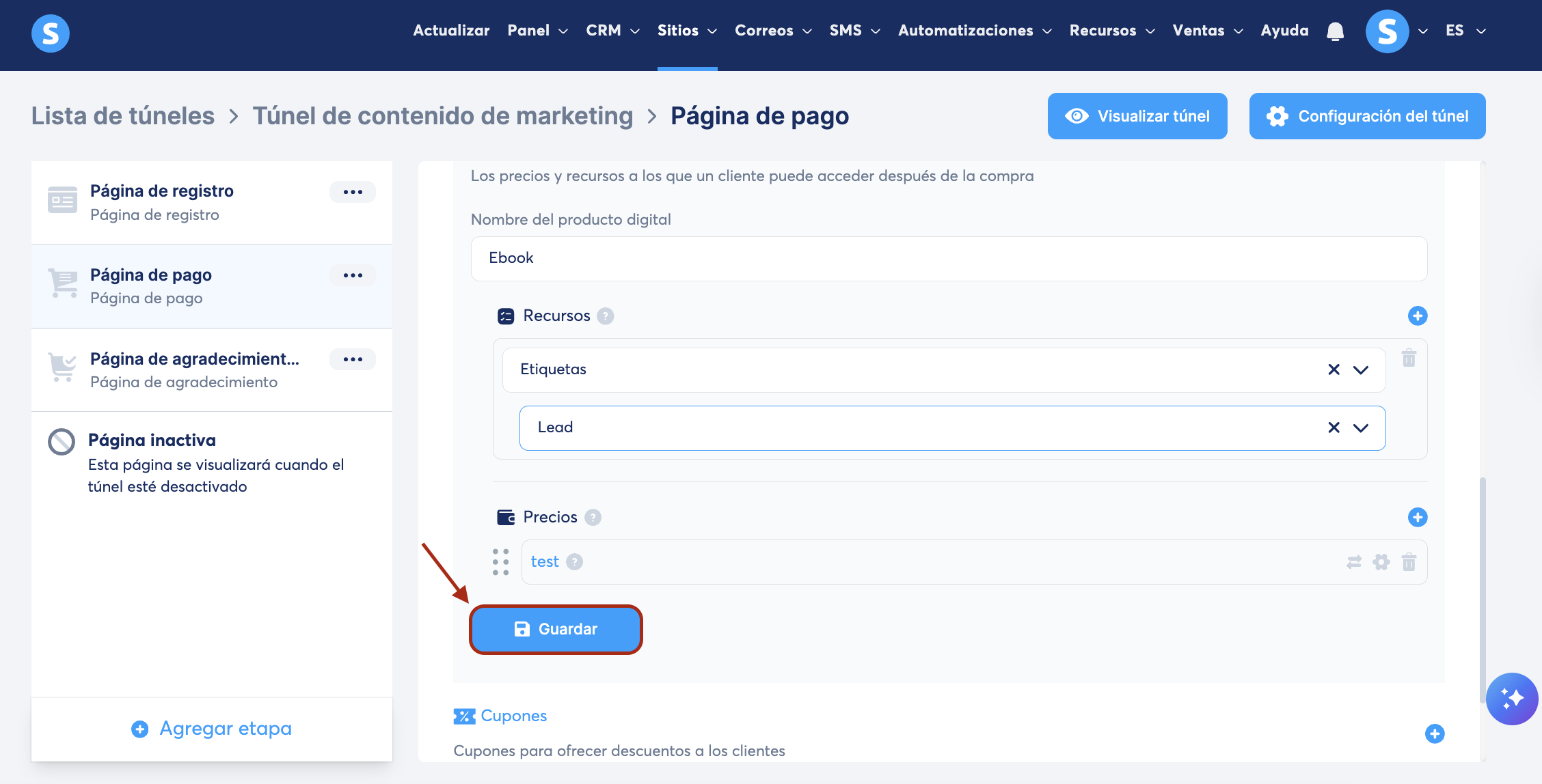 Luego de guardar el precio, haz clic en el botón principal de Guardar para finalizar la configuración de tu producto digital.
