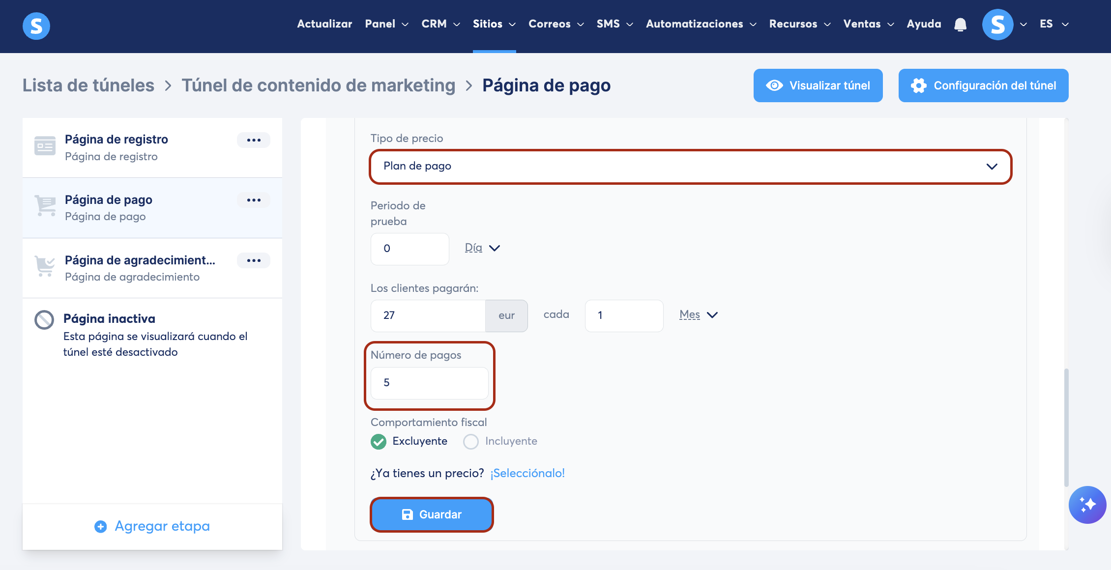 Configurar un precio del tipo Plan de pago es similar a configurar una Suscripción. La única diferencia es que debes especificar el número total de pagos (ej., ingresa 5 para 5 pagos mensuales). Luego, haz clic en Guardar.