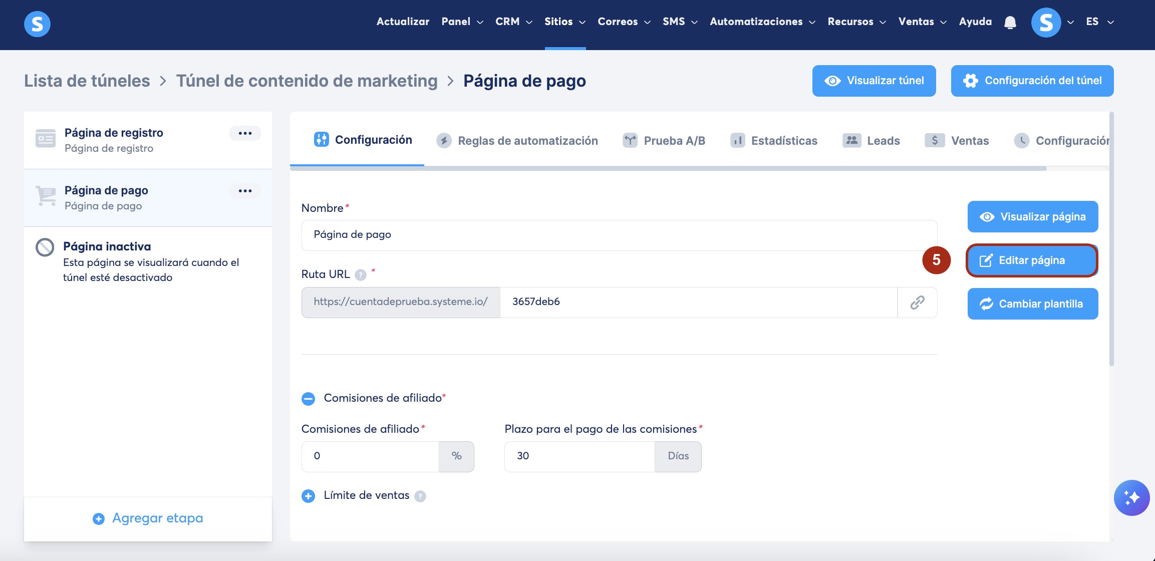 Haz clic en el botón Editar página (5) para modificar la estructura y el diseño de la página de pago.