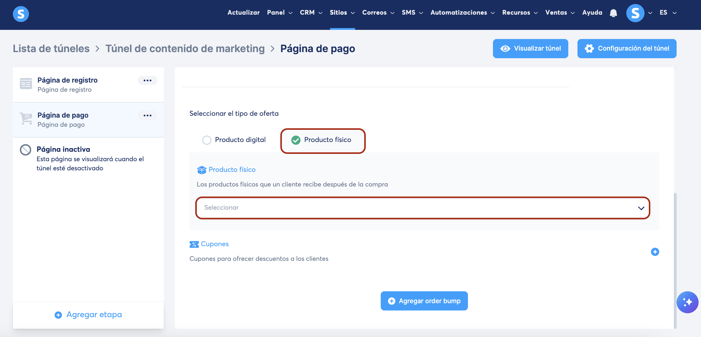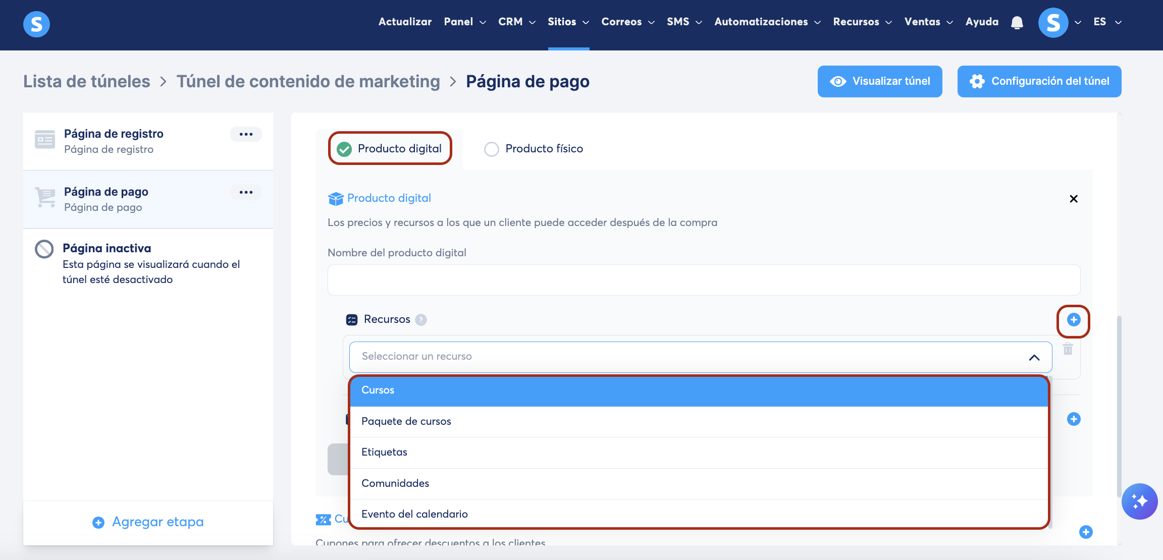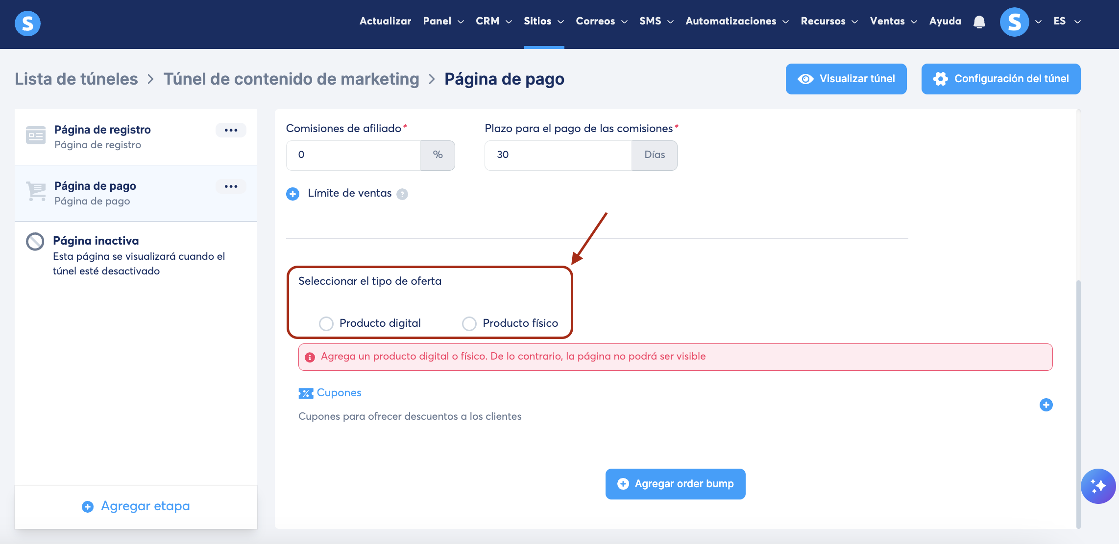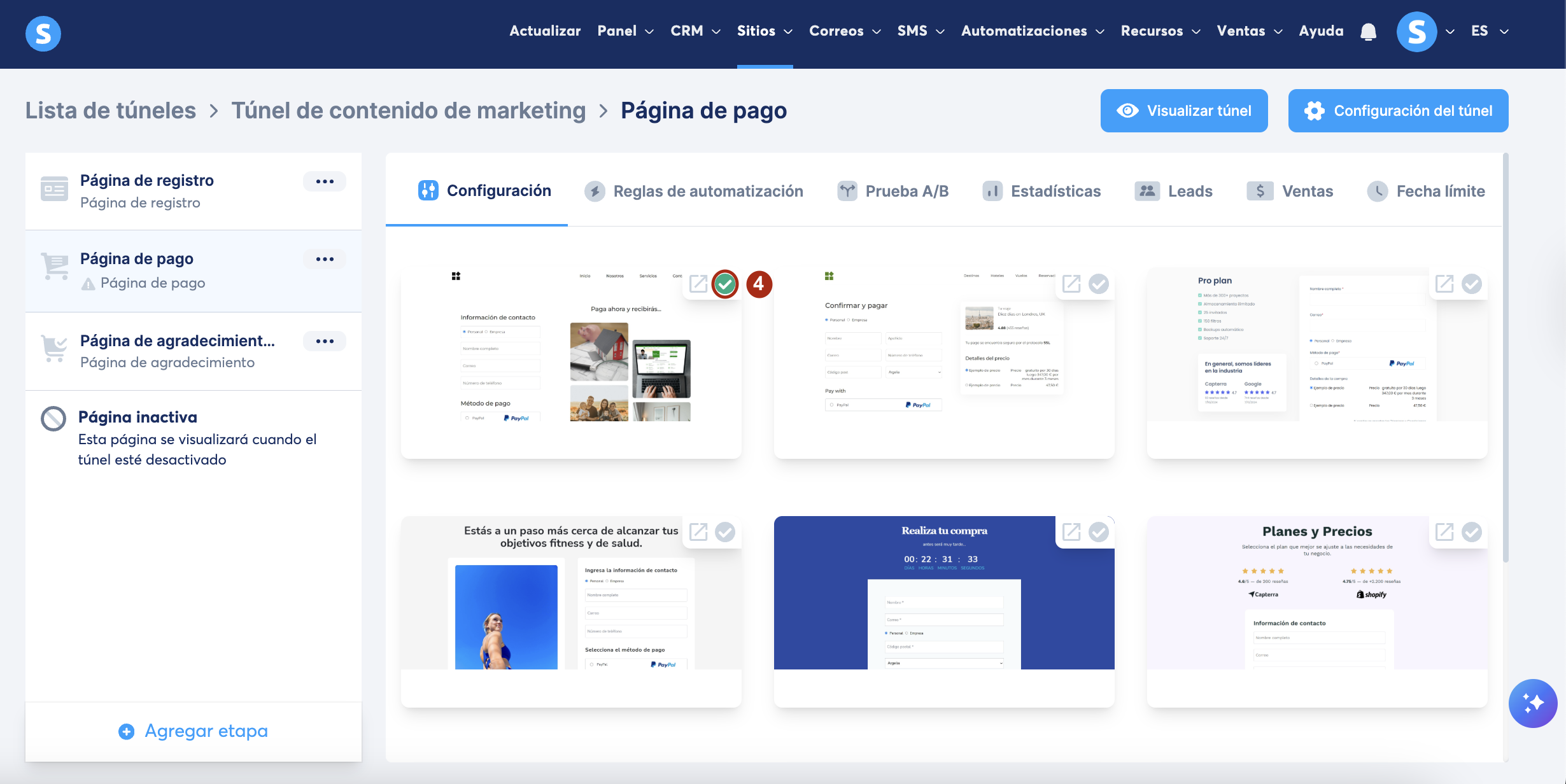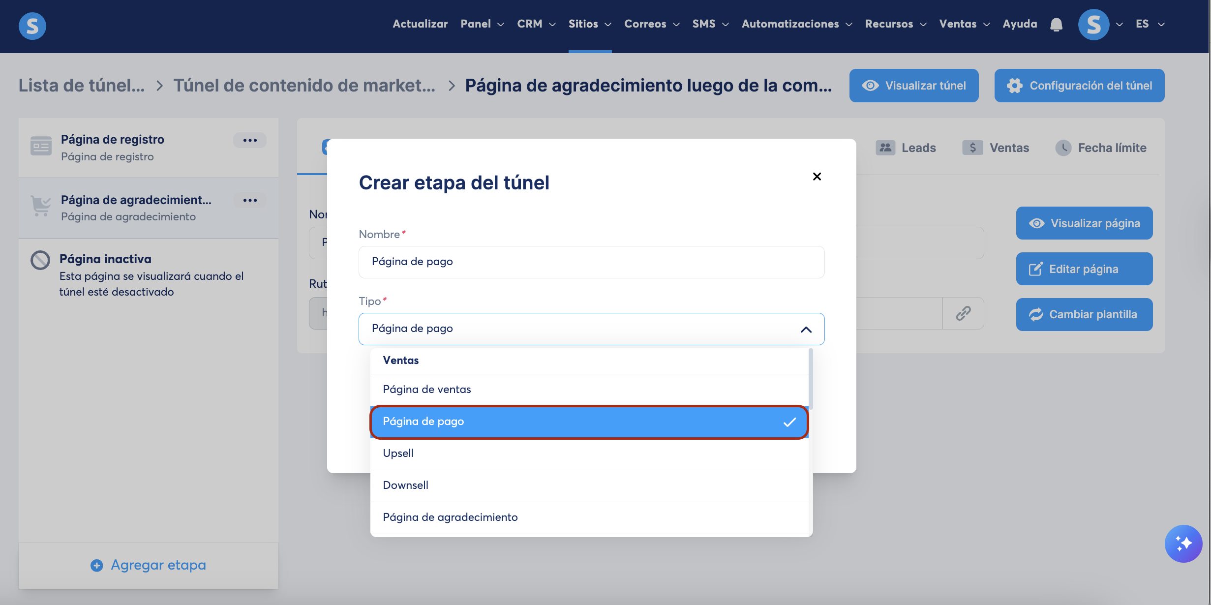 Ve al túnel de ventas en donde deseas agregar una página de pago, luego haz clic en Agregar etapa (1) en el menú de páginas del túnel a la izquierda.