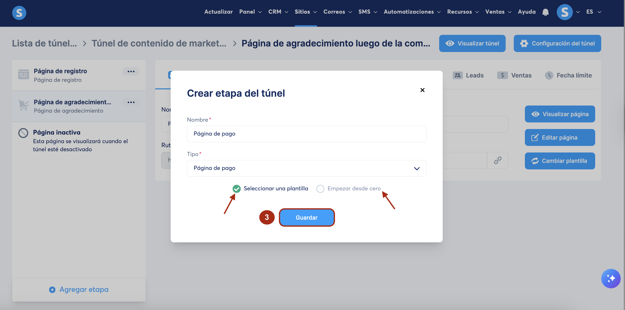 Selecciona una plantilla o empieza desde cero, luego haz clic en Guardar (3) para crear tu página.