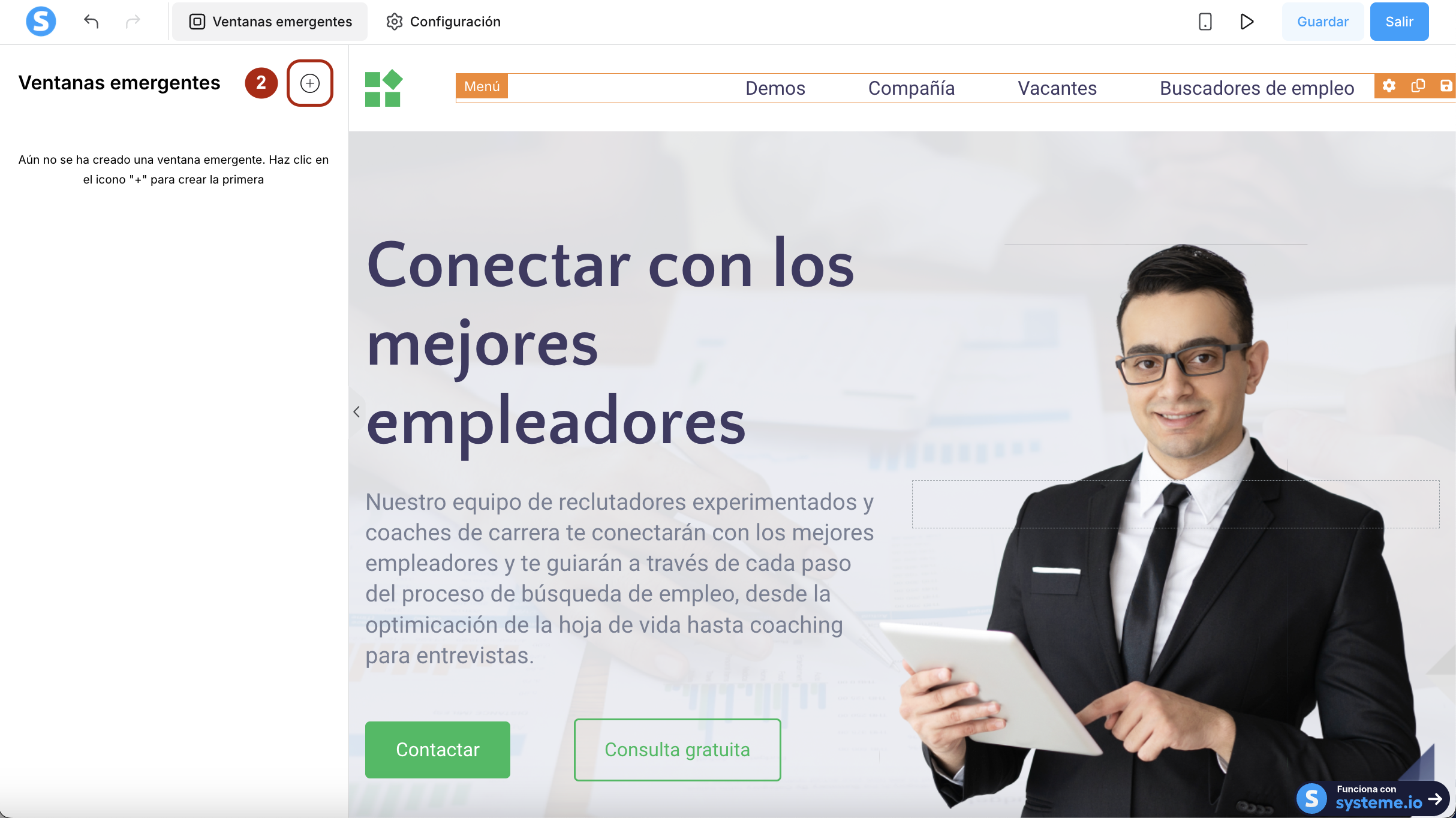 En tu editor de tu página, haz clic en el botón Ventanas emergentes, arriba a la izquierda de la página (1).