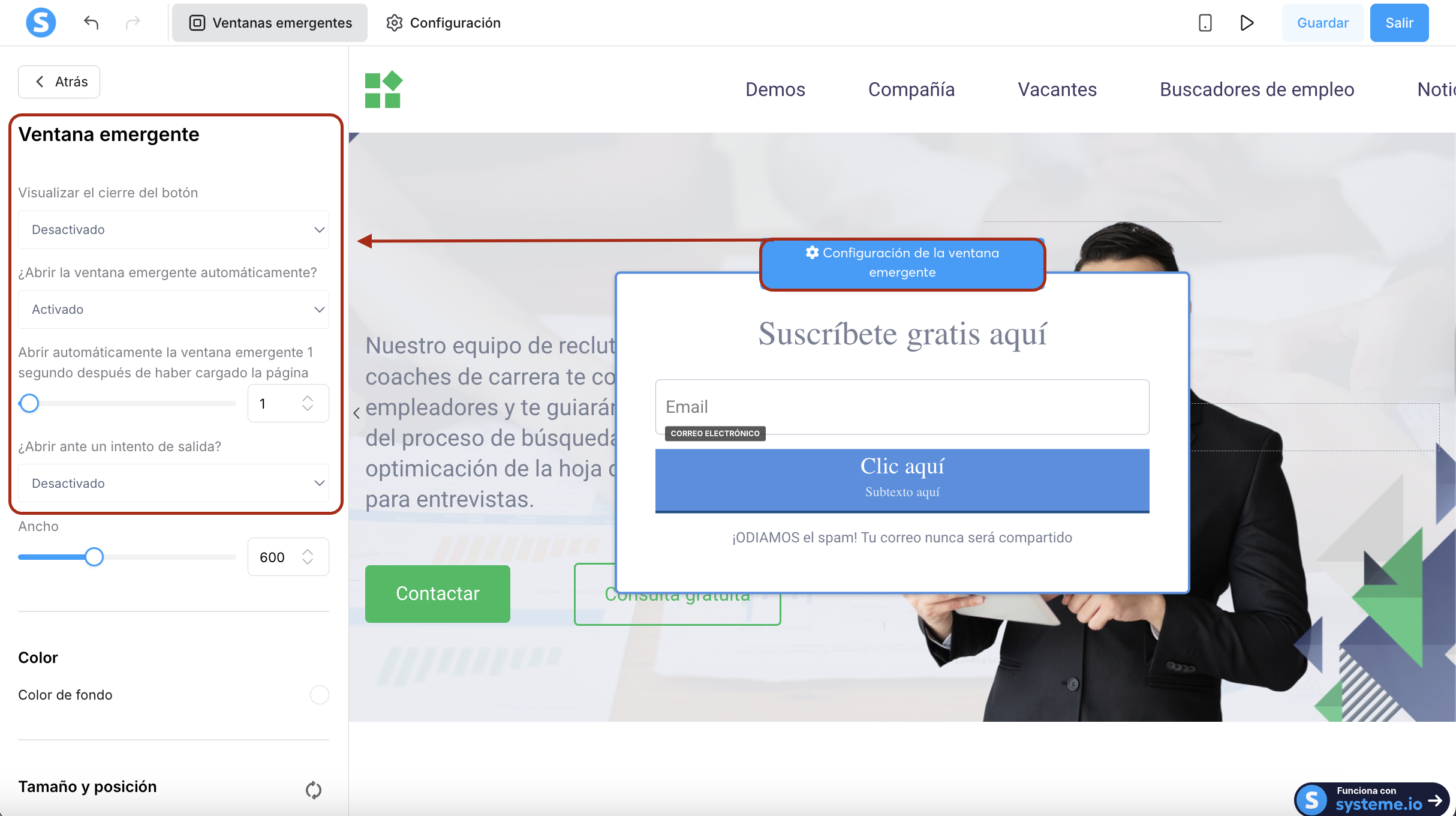 Para mostrar las opciones de la ventana emergente, haz clic en Configuración de la ventana emergente, ubicada arriba del formulario de la ventana emergente (3).