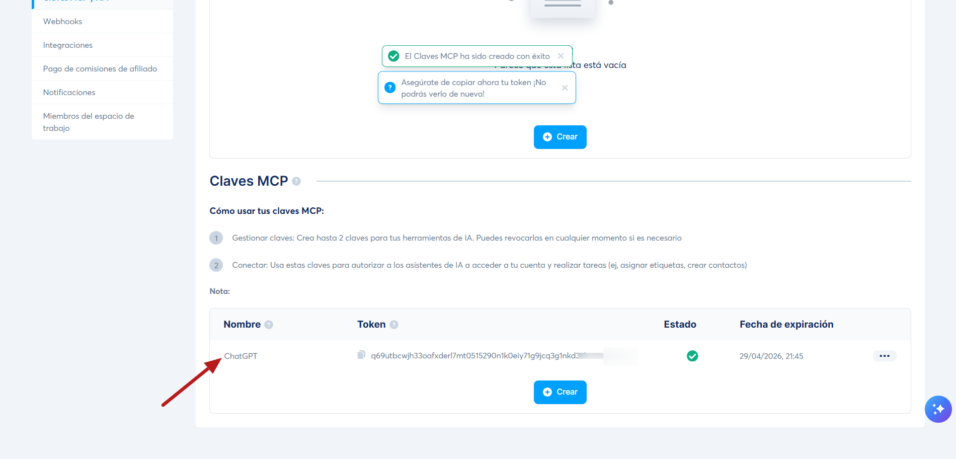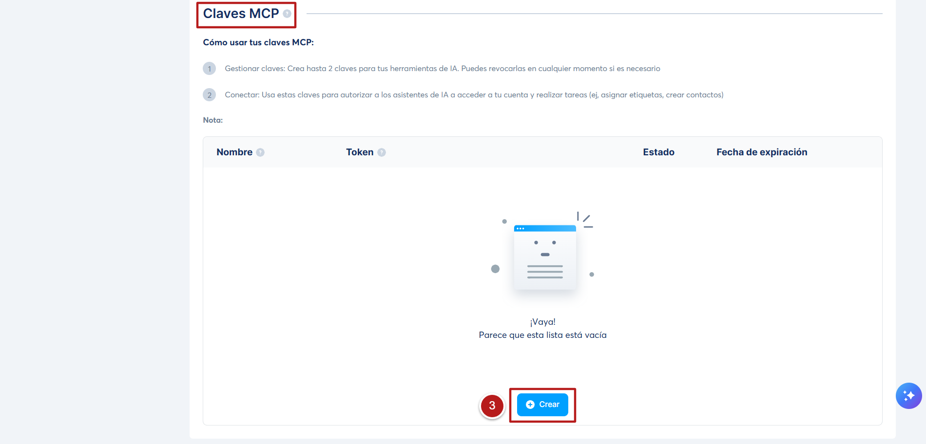 Desplázate hasta la sección Claves MCP y haz clic en Crear (3).