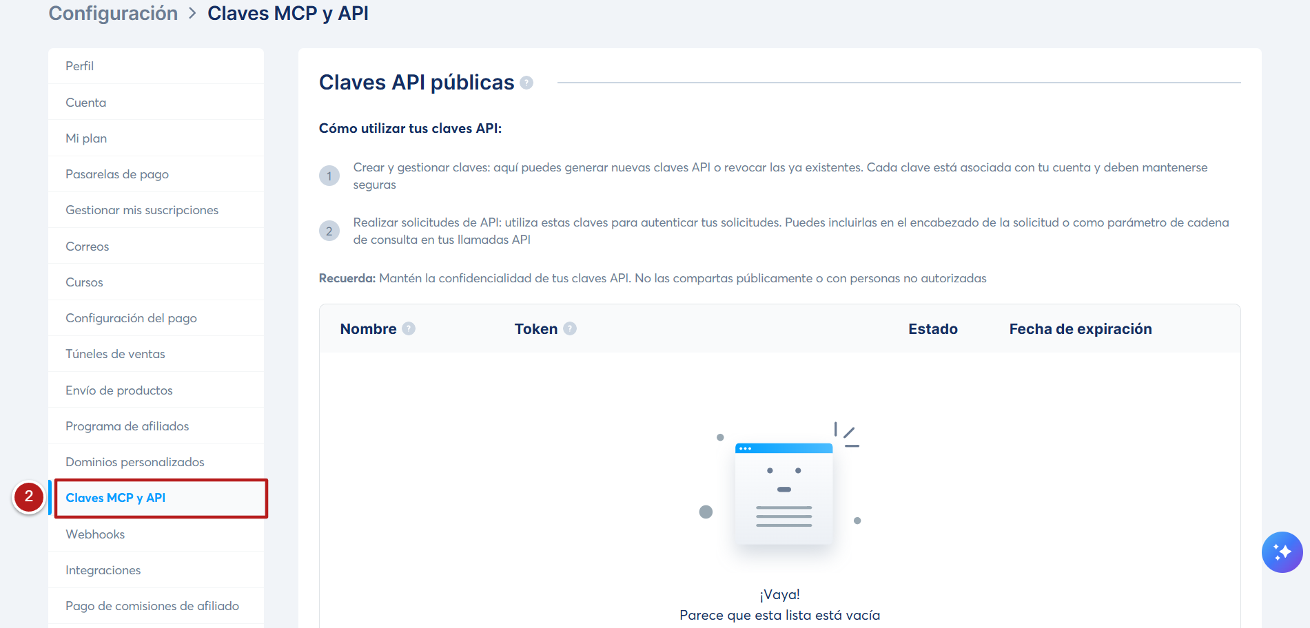 En el menú izquierdo, haz clic en Claves MCP y API (2).
