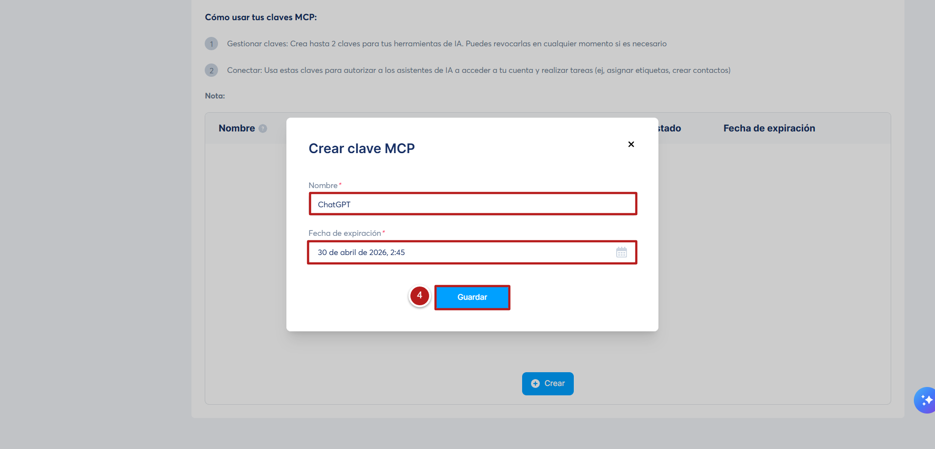 Asígnale un nombre a tu clave, establece una fecha de expiración y haz clic en Guardar (4)