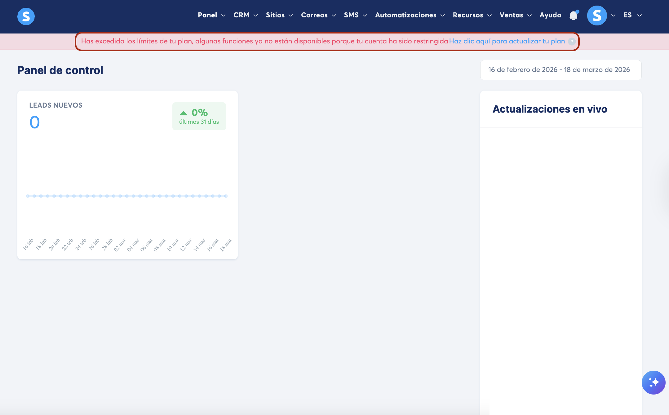 - Una alerta permanente se muestra en el panel de systeme.io.