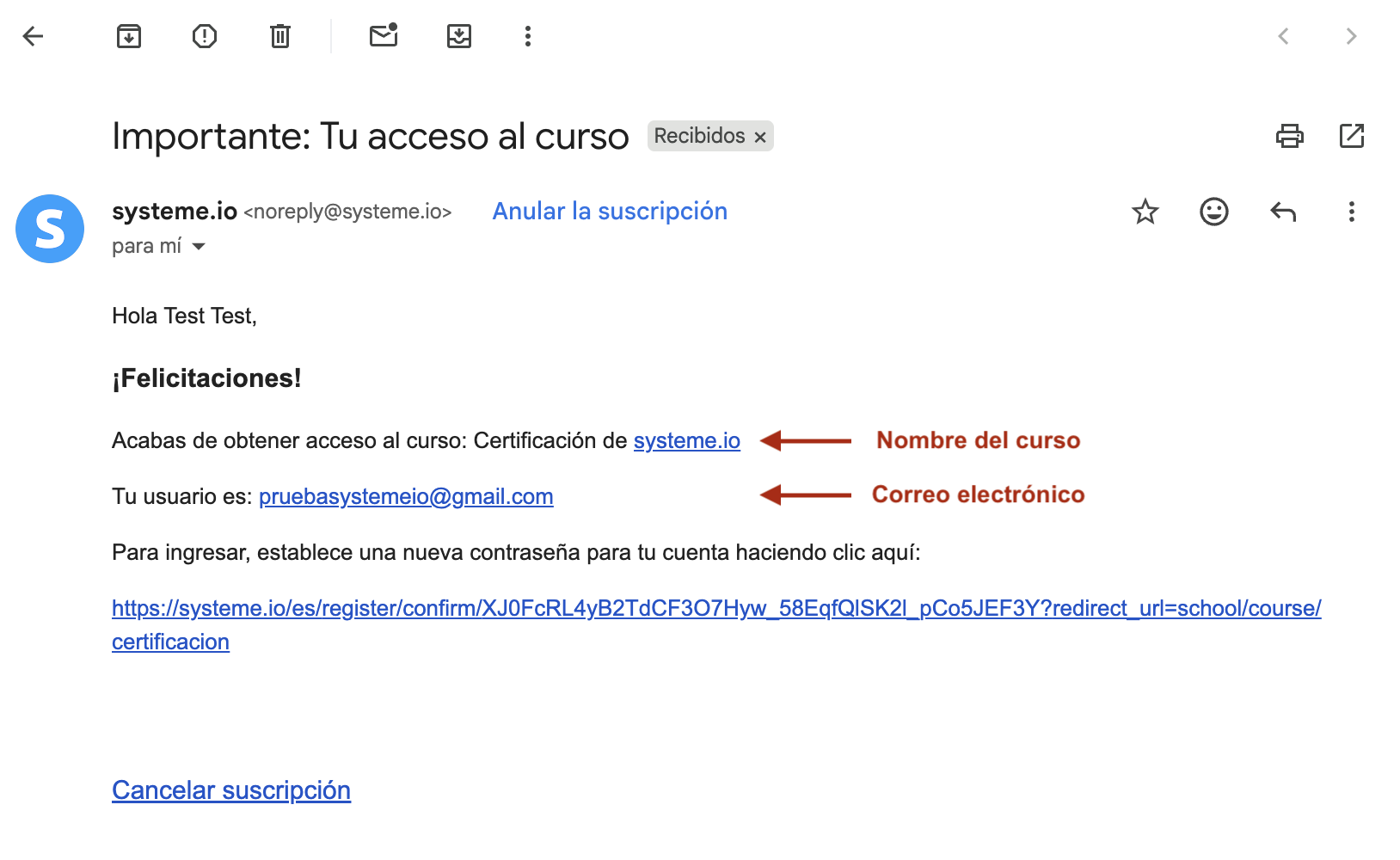 Luego de que un estudiante se uno a un curso a través de una página de pago, una página de registro o manualmente, recibirá un mensaje que contiene un mensaje de felicitación a tu nombre, así como su nombre de usuario y un enlace para elegir su contraseña.