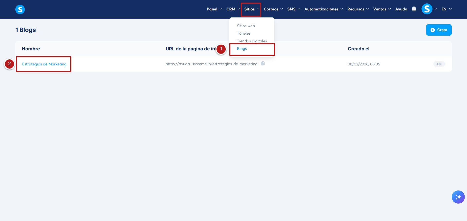 Ve a Blogs dentro de la pestaña Sitios (1), luego haz clic en el nombre de tu blog (2).