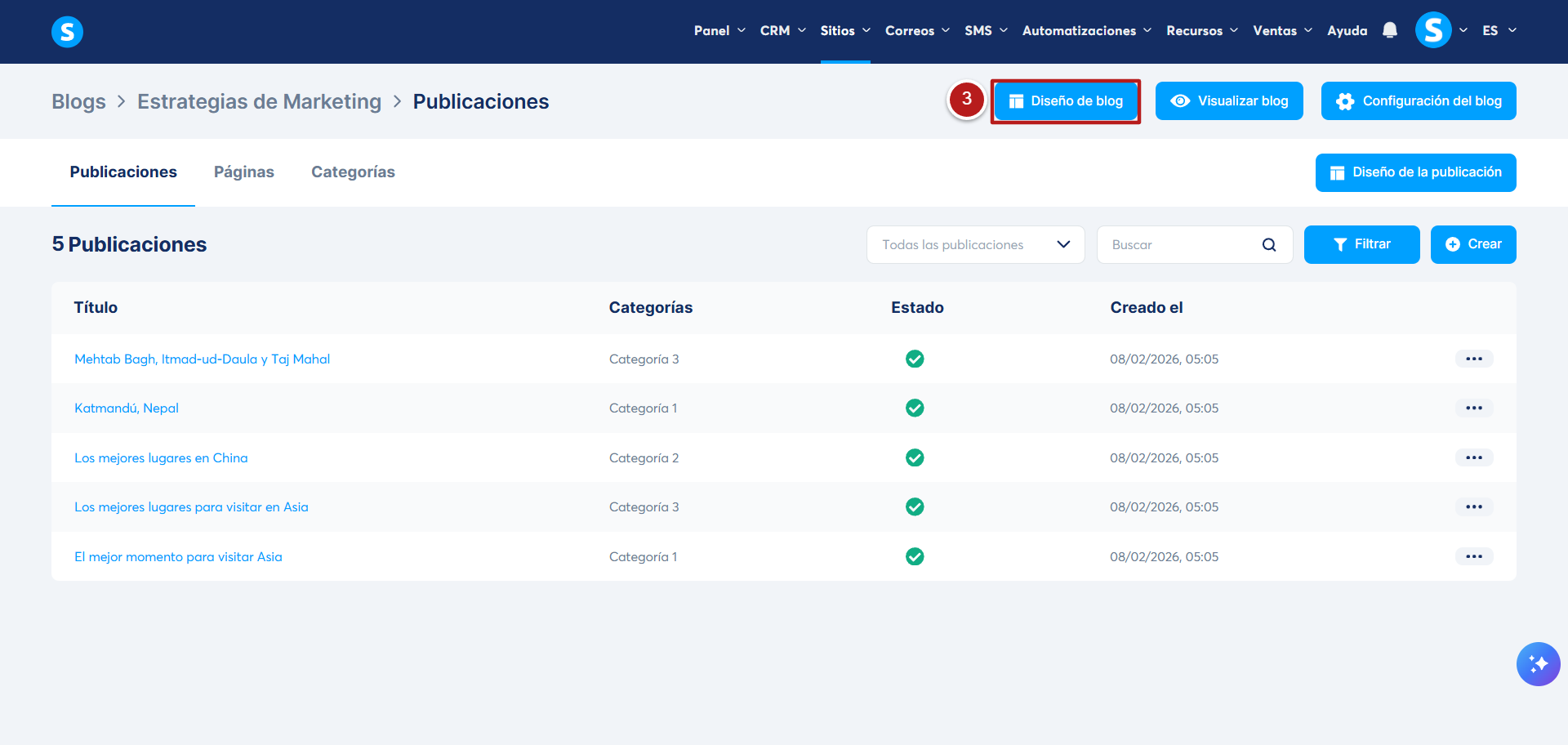 Desde el menú del blog, haz clic en el botón Diseño del blog (3).