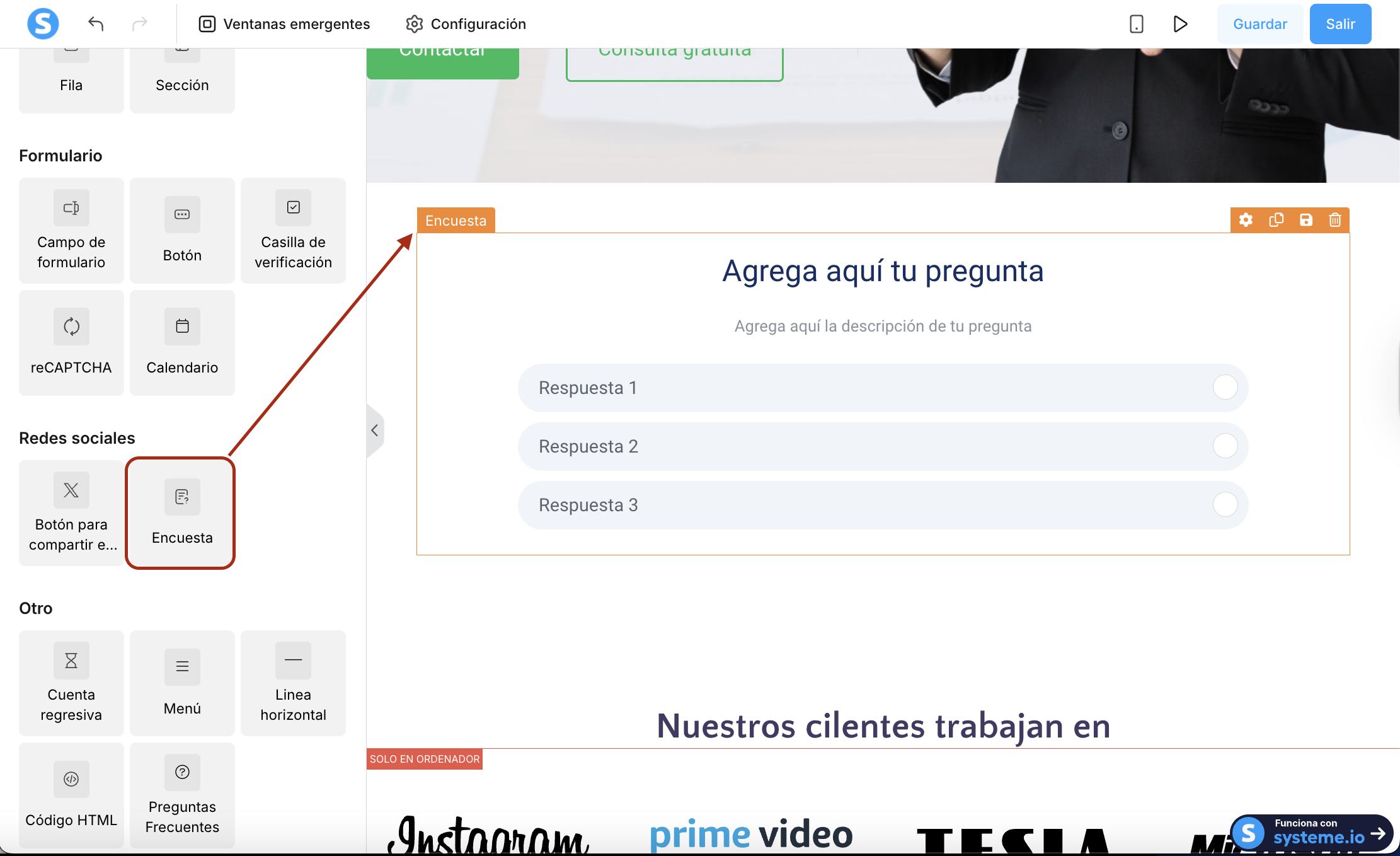 - Para los cursos, crea la encuesta en la página de un túnel. Luego inserta un enlace dentro del curso para redireccionar a los estudiantes a esa página.