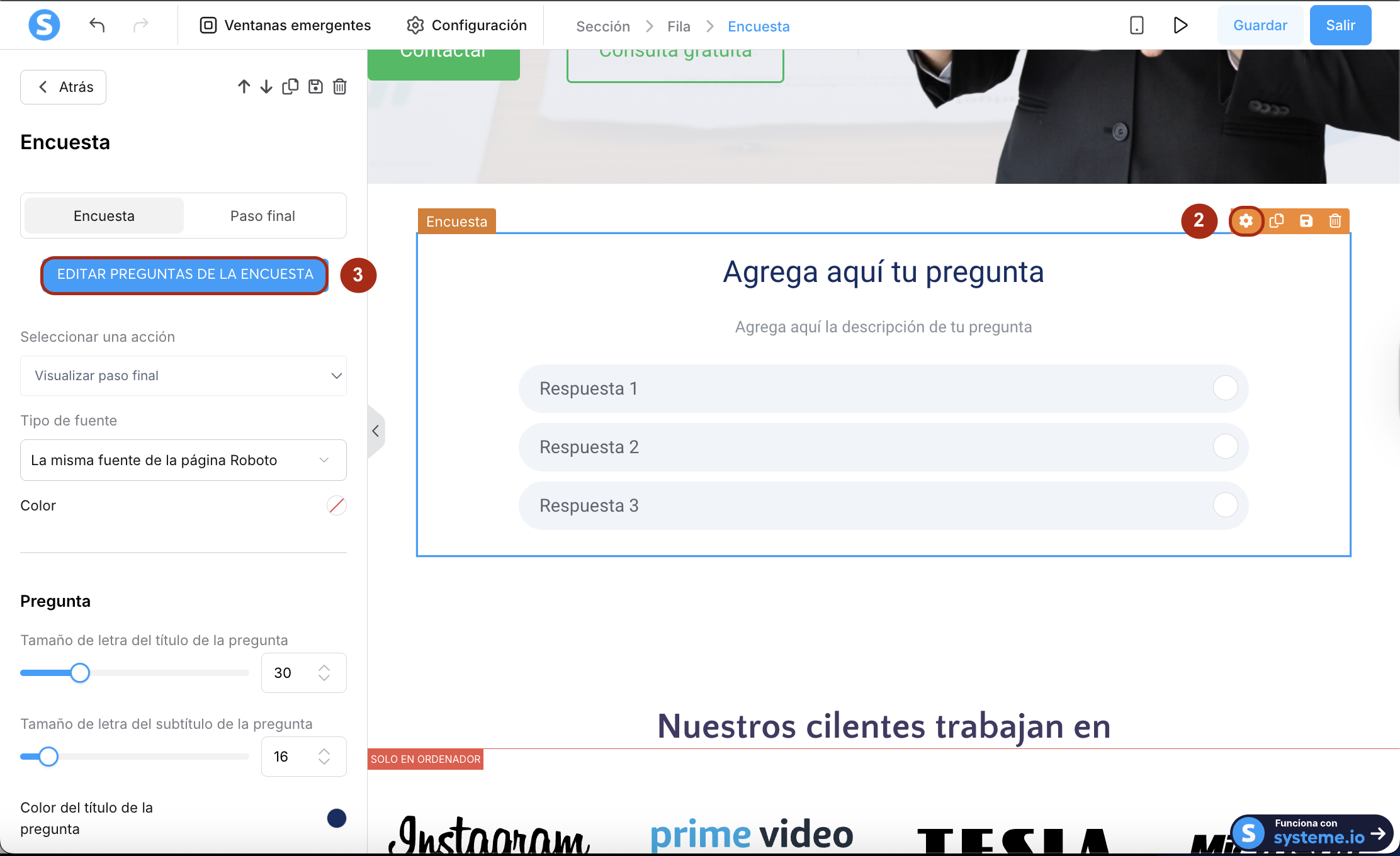 Para editar las preguntas de la encuesta, haz clic en el icono de configuración (2), luego haz clic en Editar preguntas de la encuesta (3).