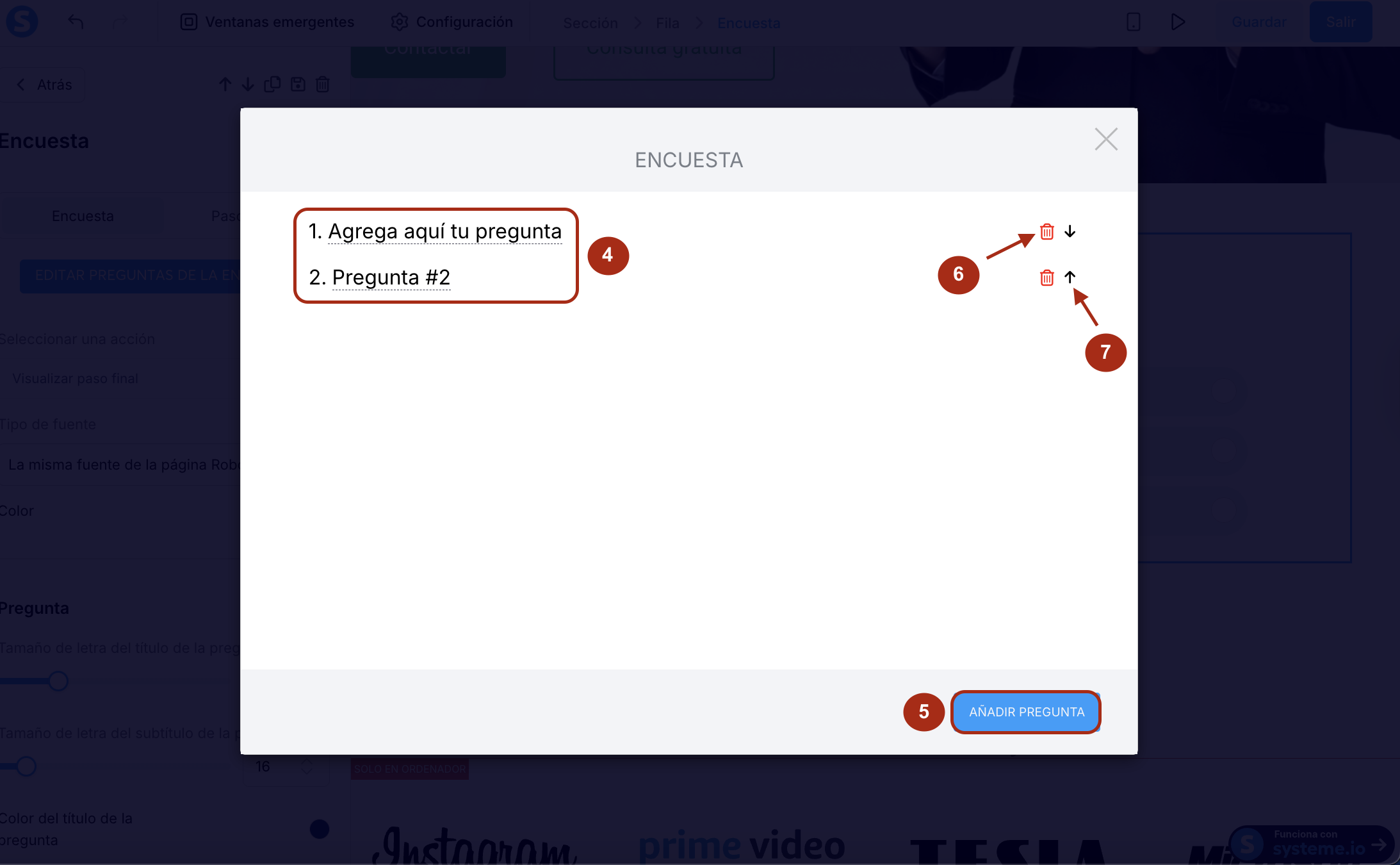 - Para reordenar una pregunta, haz clic en el ícono de la flecha (7)