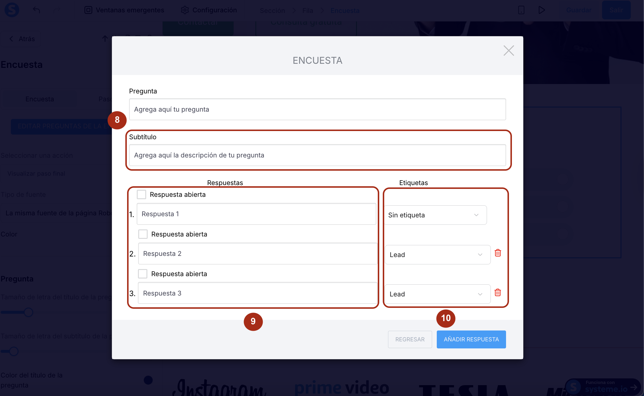 - Hacer clic en Añadir respuesta para añadir diferentes respuestas a tus preguntas (9)