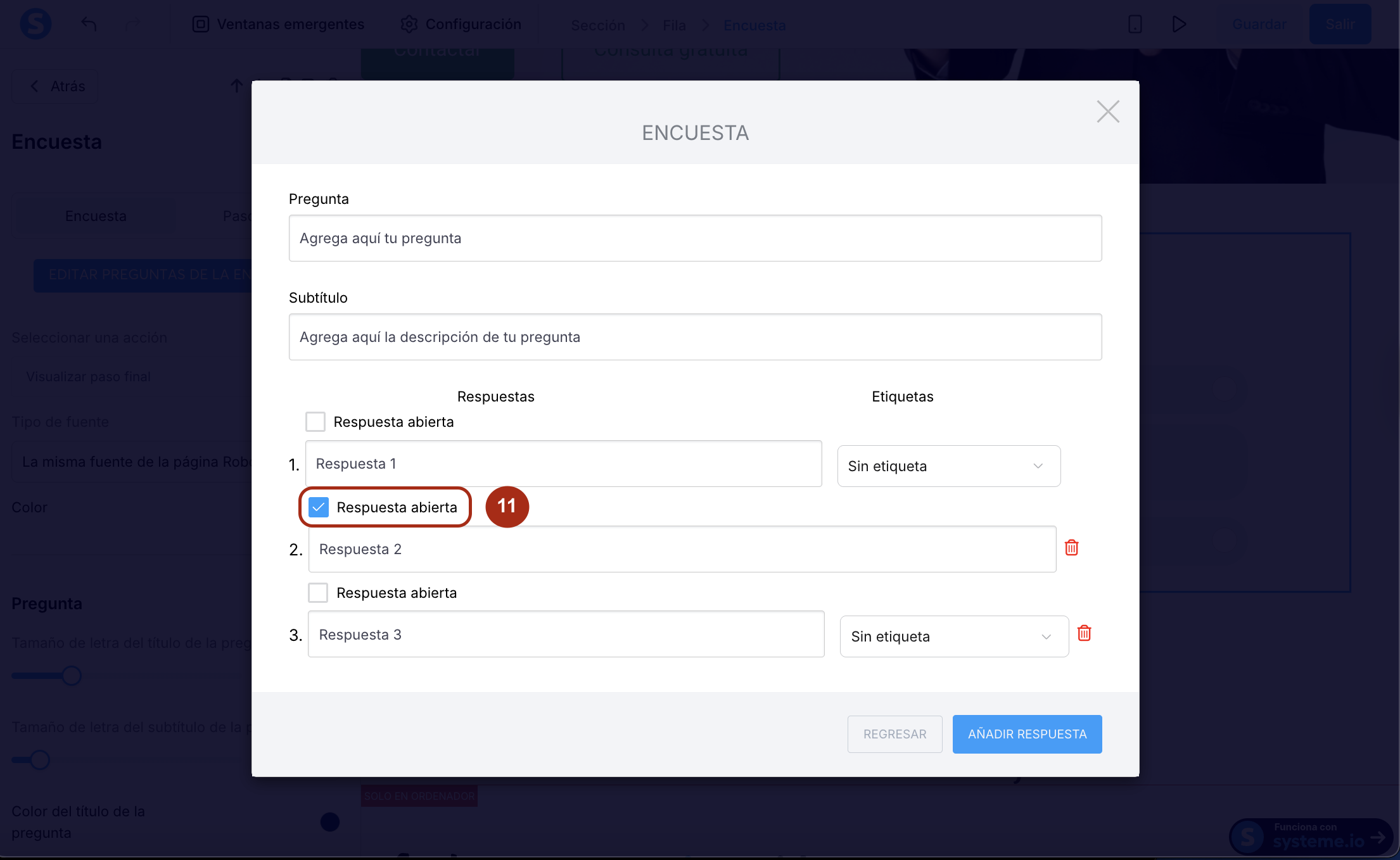 También puede permitir el envío de una respuesta abierta a una pregunta, seleccionando la casilla Pregunta abierta (11).