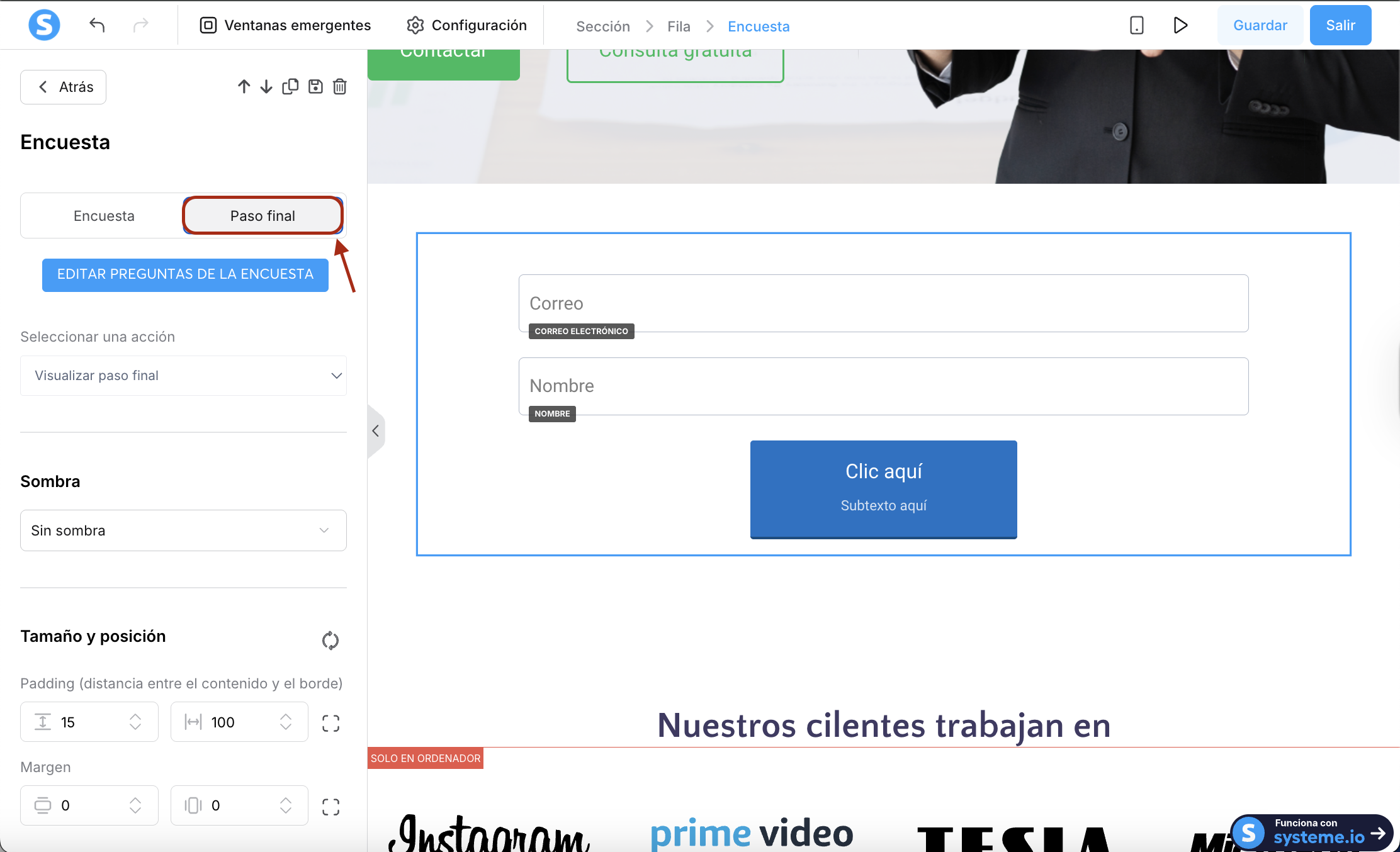 Por último, haz clic en Paso final para configurar el botón y los campos de formulario: