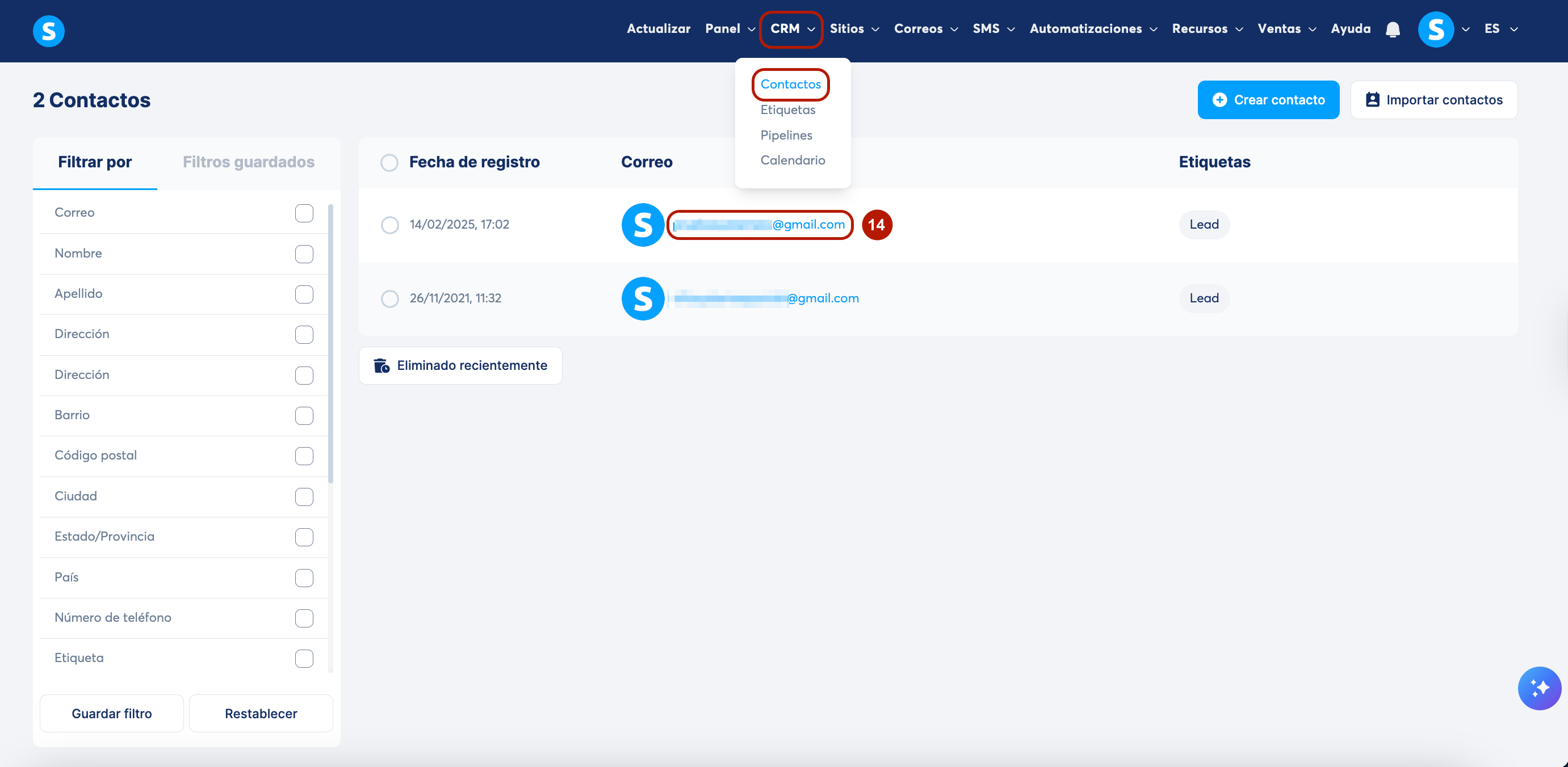 Para acceder al registro de un contacto, ve a CRM > Contactos, luego haz clic en el correo electrónico del contacto (14).