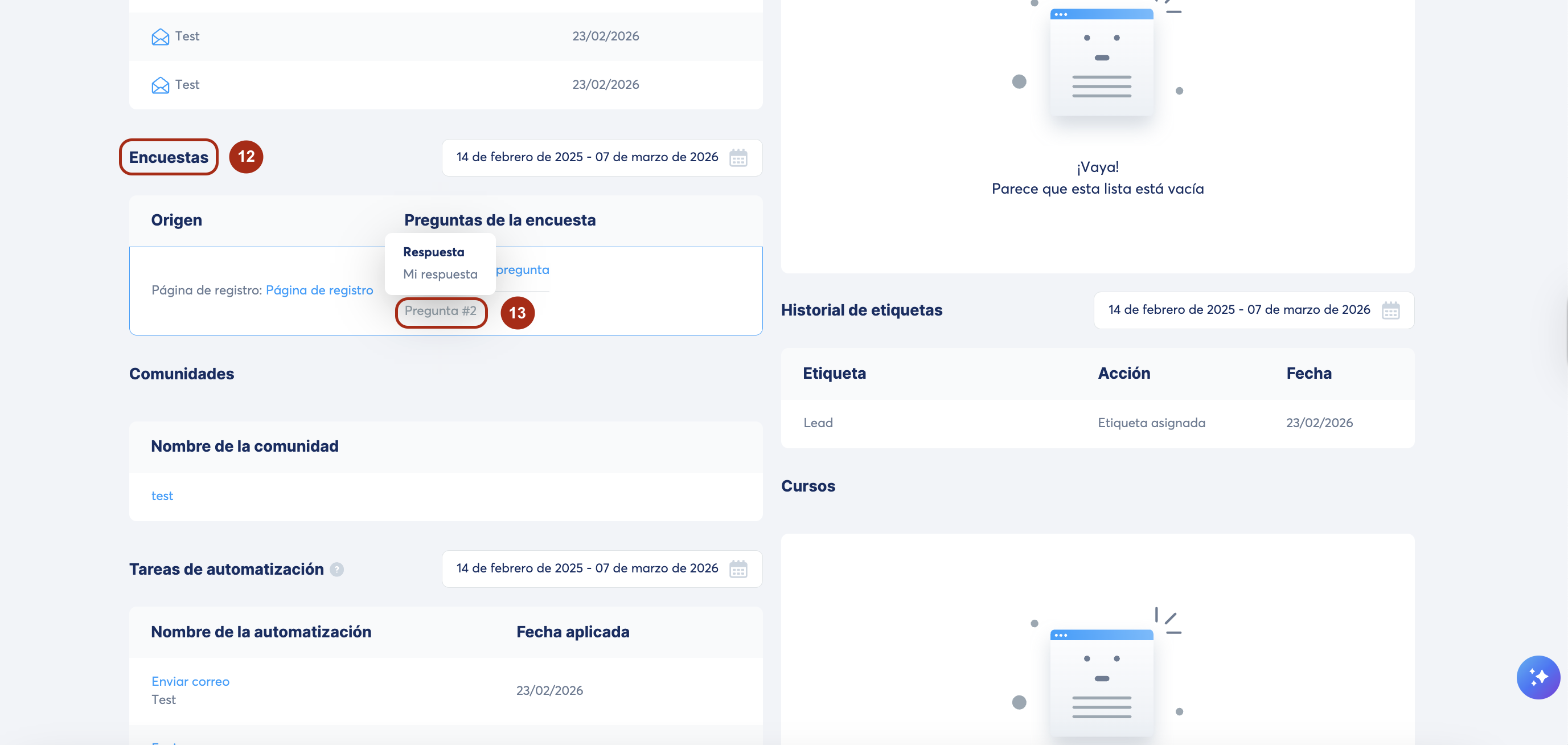 Las respuestas de los contactos las puedes encontrar en sus respectivos registros. Desplázate hasta la sección Encuesta (12) luego haz clic en la pregunta (13) para ver la respuesta.