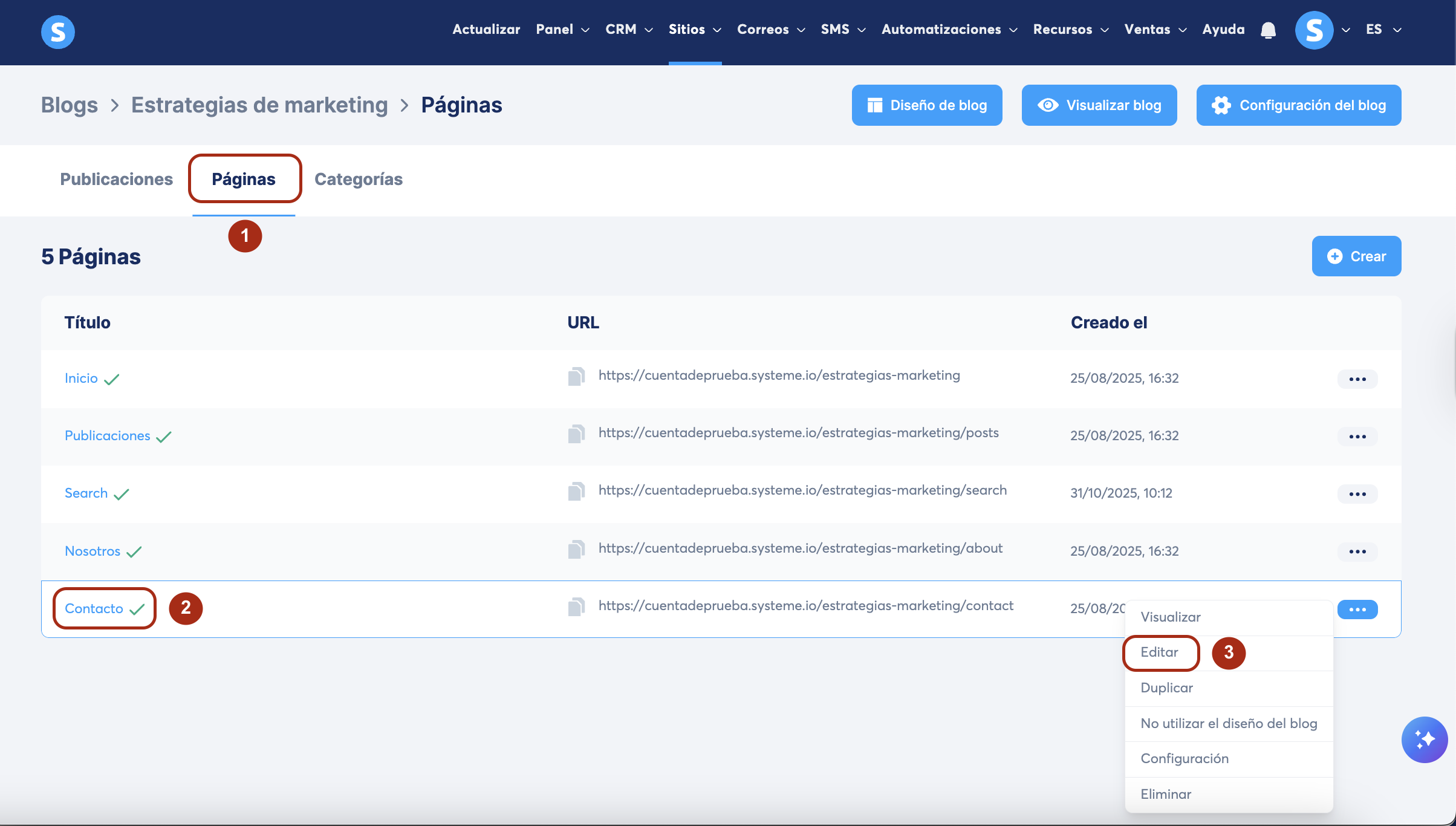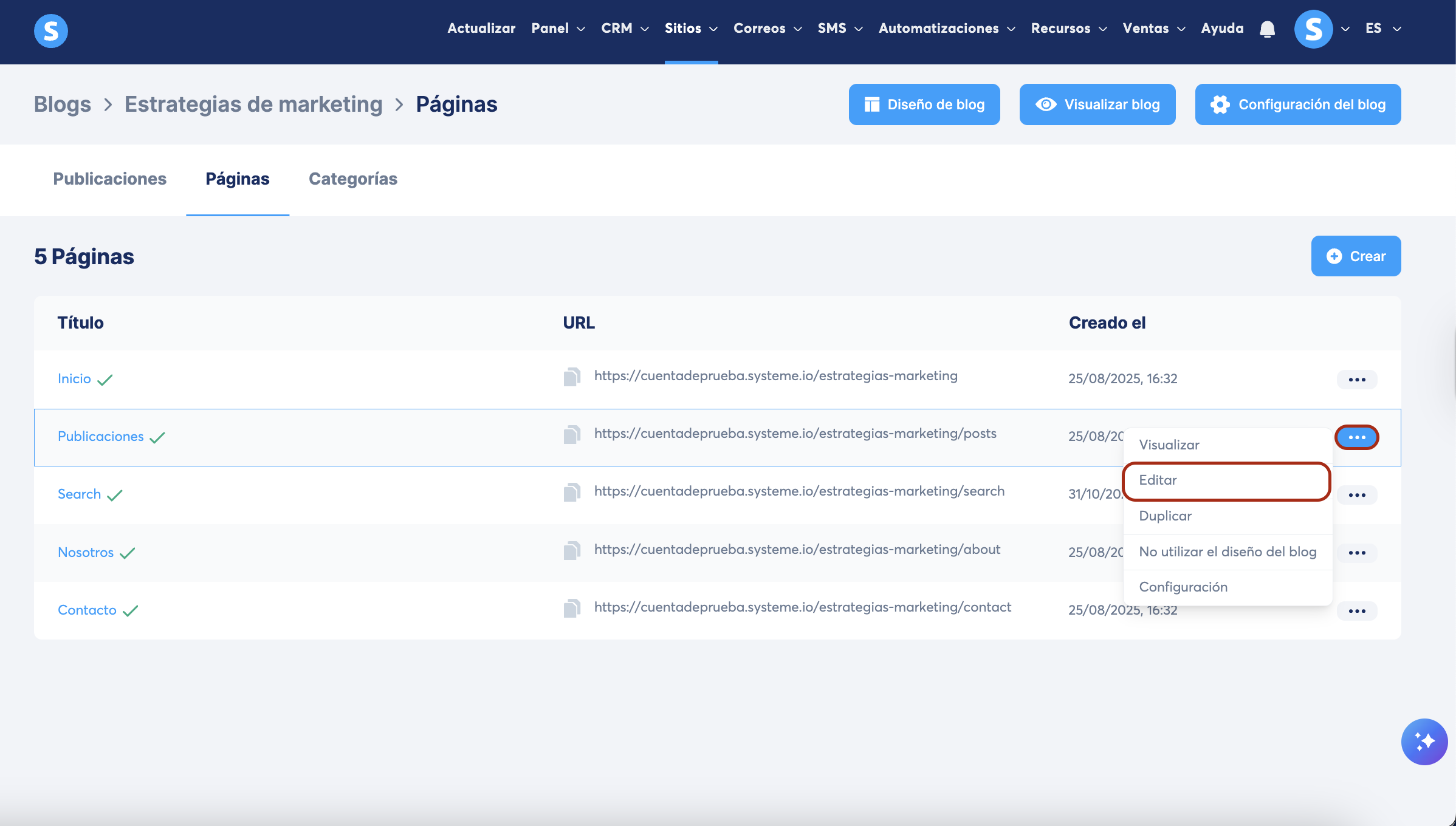 Para hacerlo, haz clic en el menú de los tres puntos a la derecha para abrir el editor de la página de blog deseada.