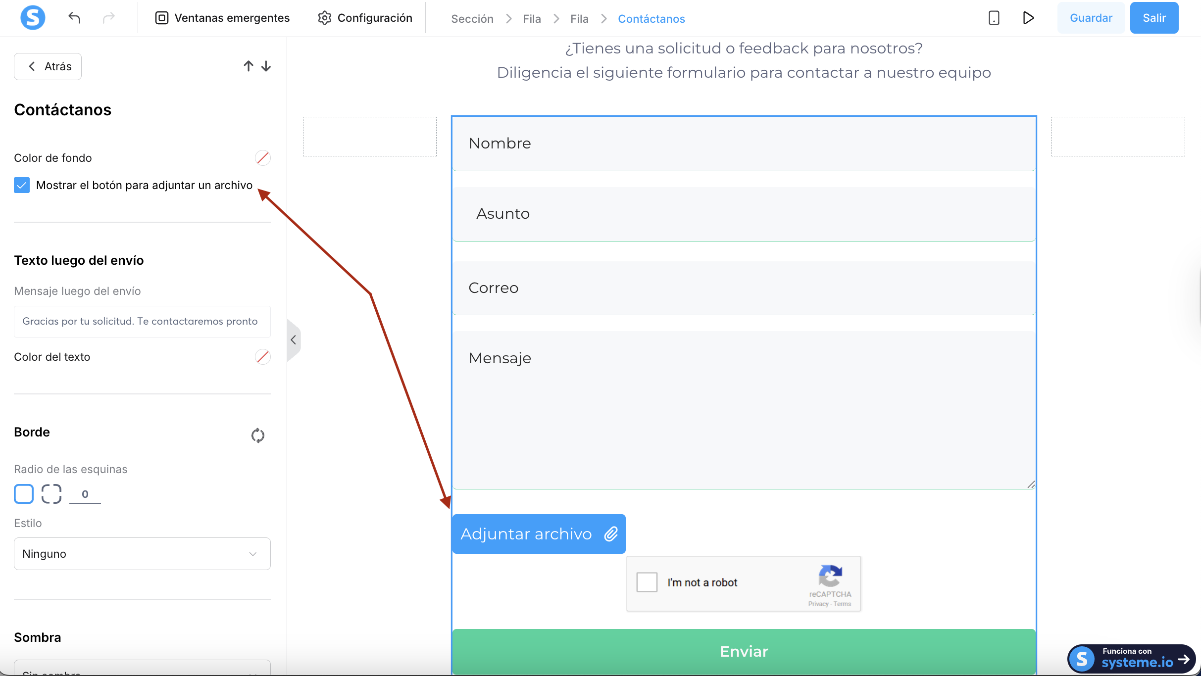 - Mostrar el botón para adjuntar un archivo: activa esta opción para permitir que los visitantes carguen un archivo al enviar el formulario. Al activarse, un botón de adjuntar archivo aparecerá en el formulario, permitiendo que los usuarios envíen jun archivo junto a su mensaje.
