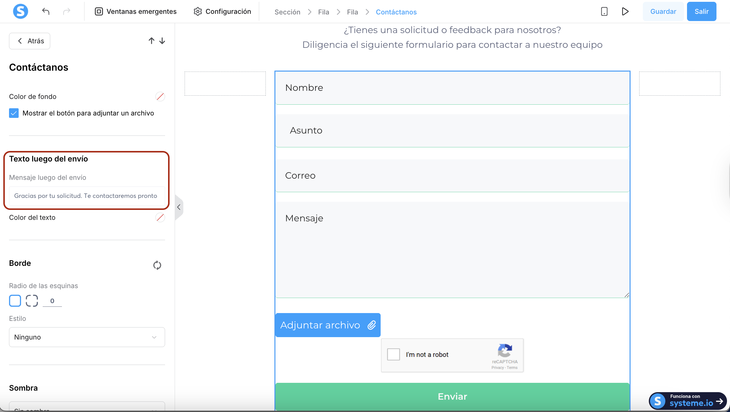 - Mensaje luego del envío: ingresa el mensaje de confirmación que se mostrará luego de que el visitante envíe el formulario.