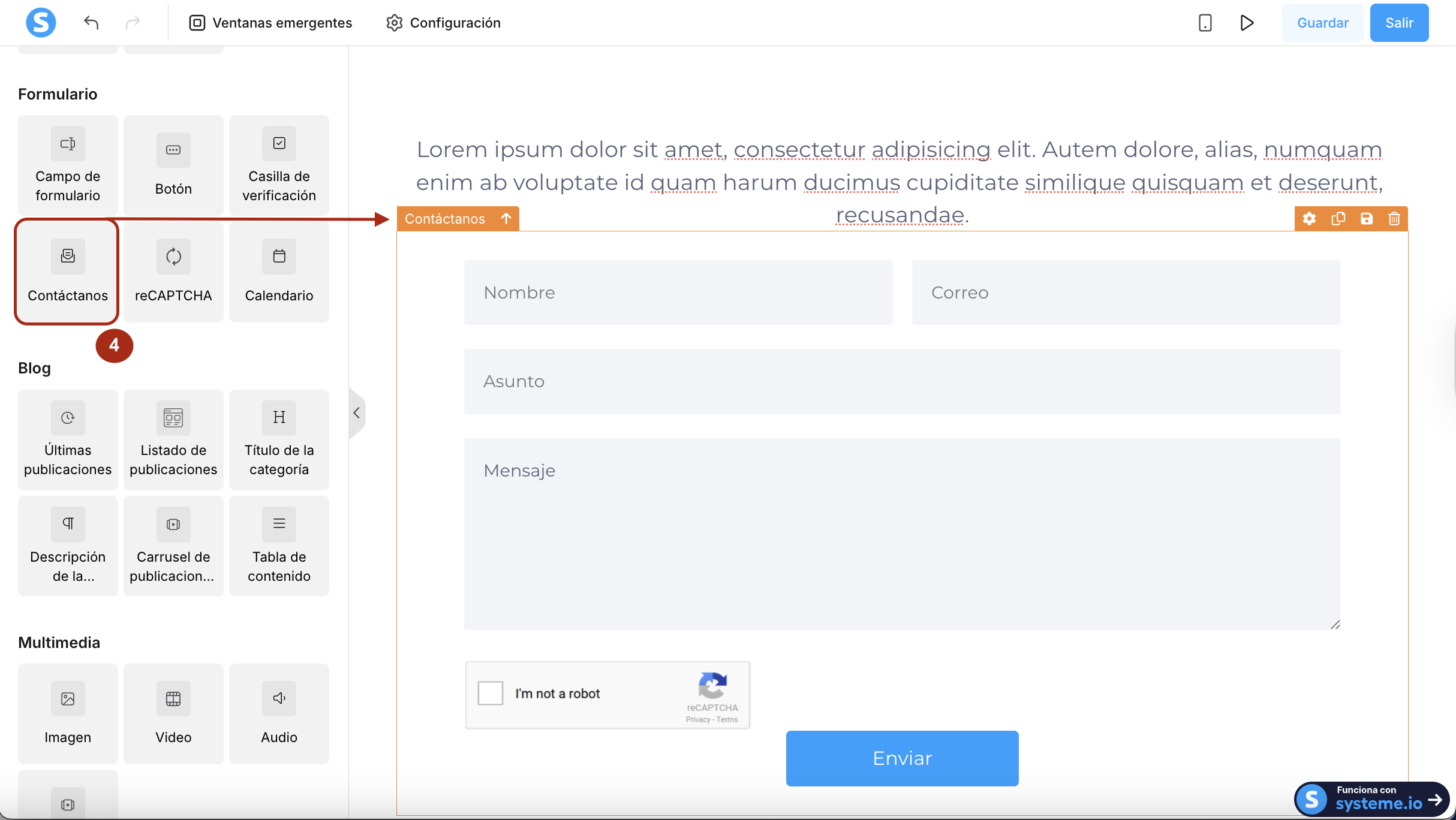 - Desde el panel izquierdo de elementos, arrastra el elemento Contáctanos y suéltalo a donde te gustaría que apareciera el formulario (4)