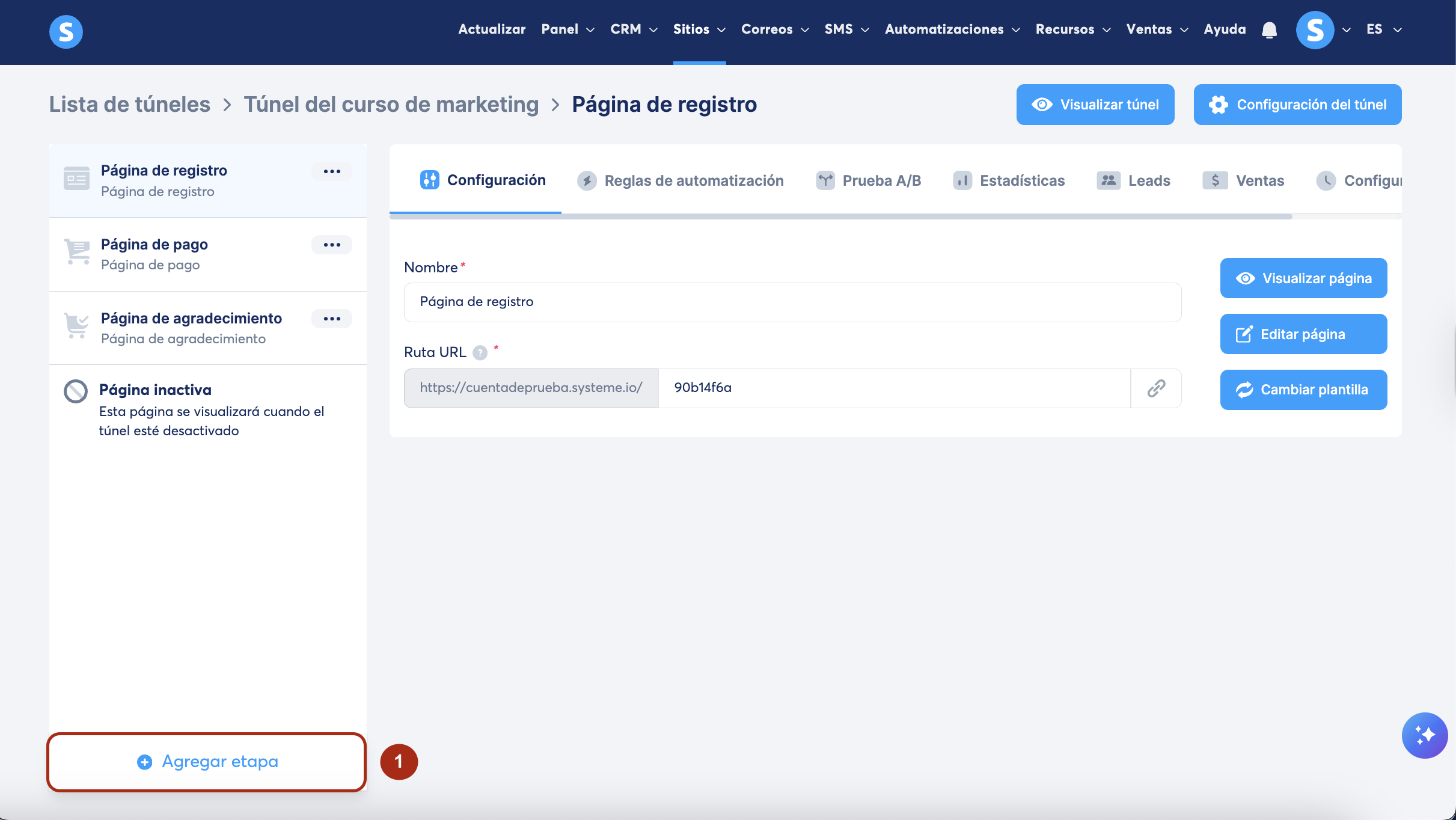 - Crea una nueva etapa en un túnel de ventas haciendo clic en Agregar etapa (1)