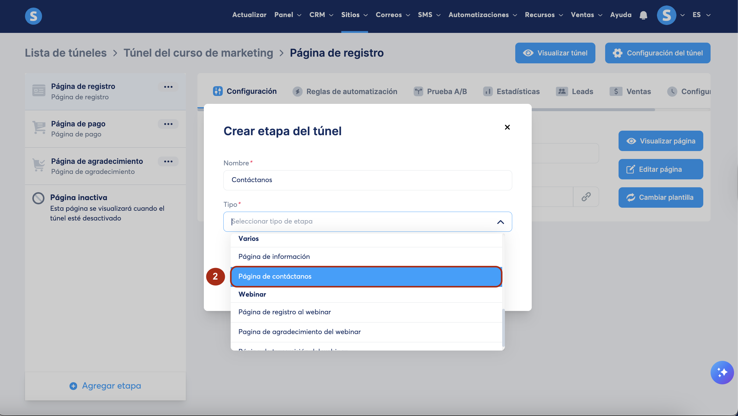 - En el campo Tipo, selecciona Página de contáctanos (2).