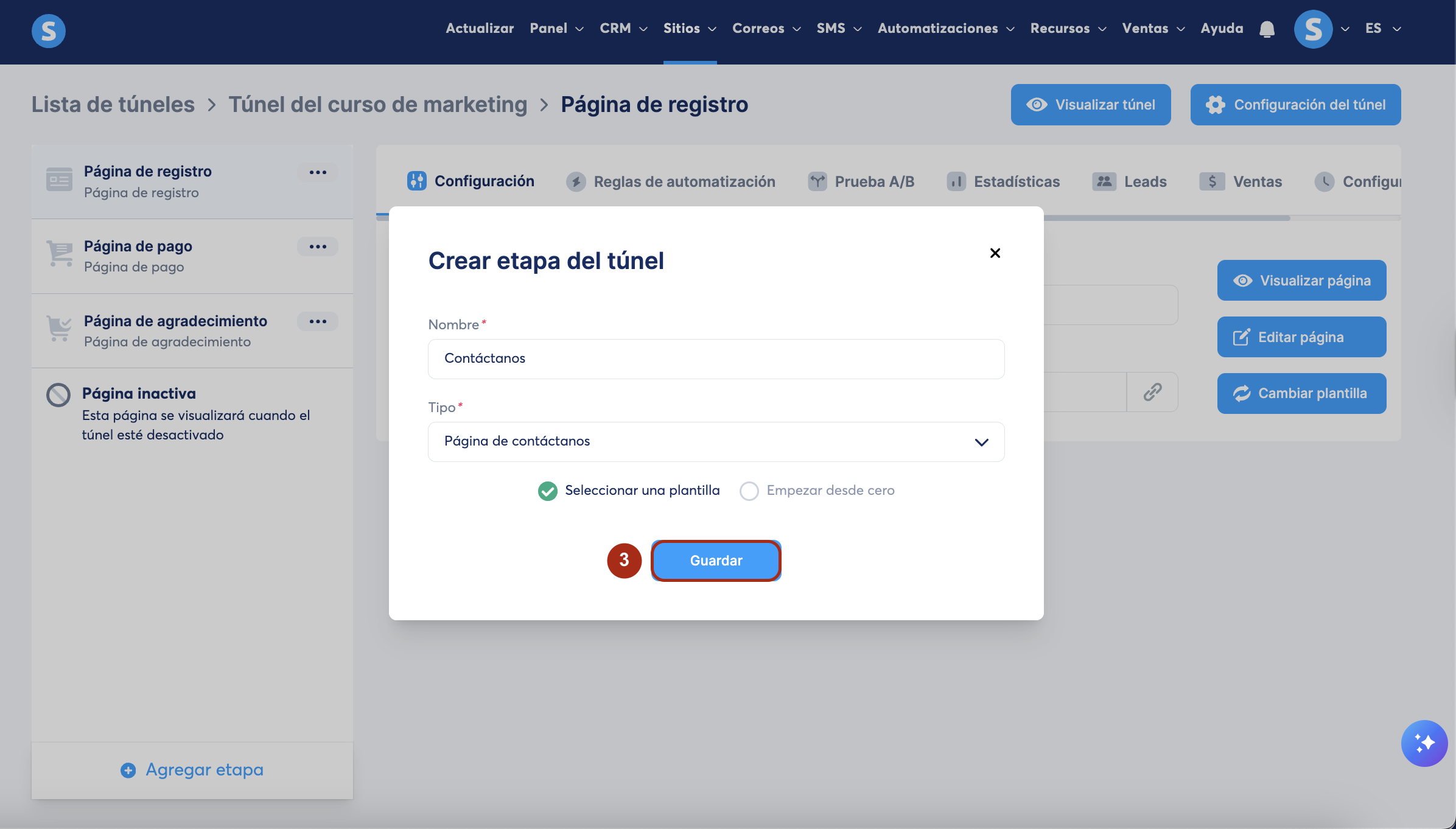 - Asígnale un nombre a la etapa, haz clic en Seleccionar una plantilla y luego clic en Guardar (3).