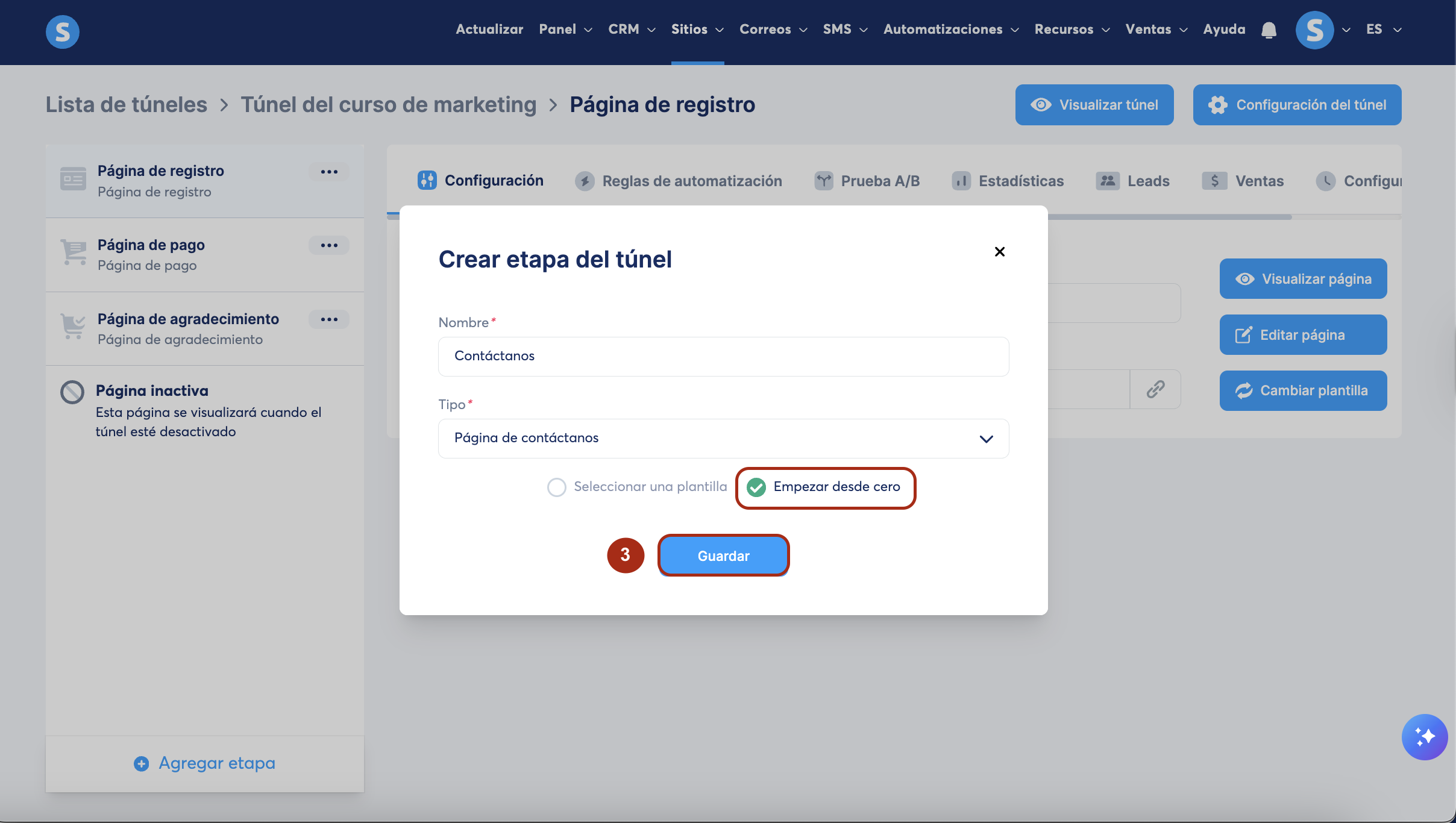 - Asígnale un nombre a la etapa, haz clic en Empezar desde cero y luego clic en Guardar (3).