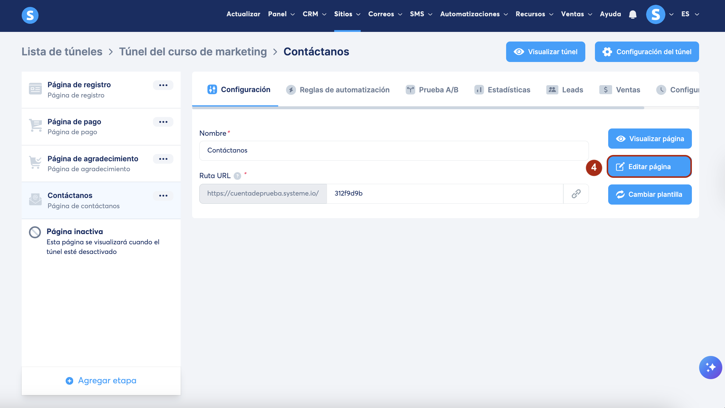 - Para personalizar tu página, haz clic en Editar página para acceder al editor (4).