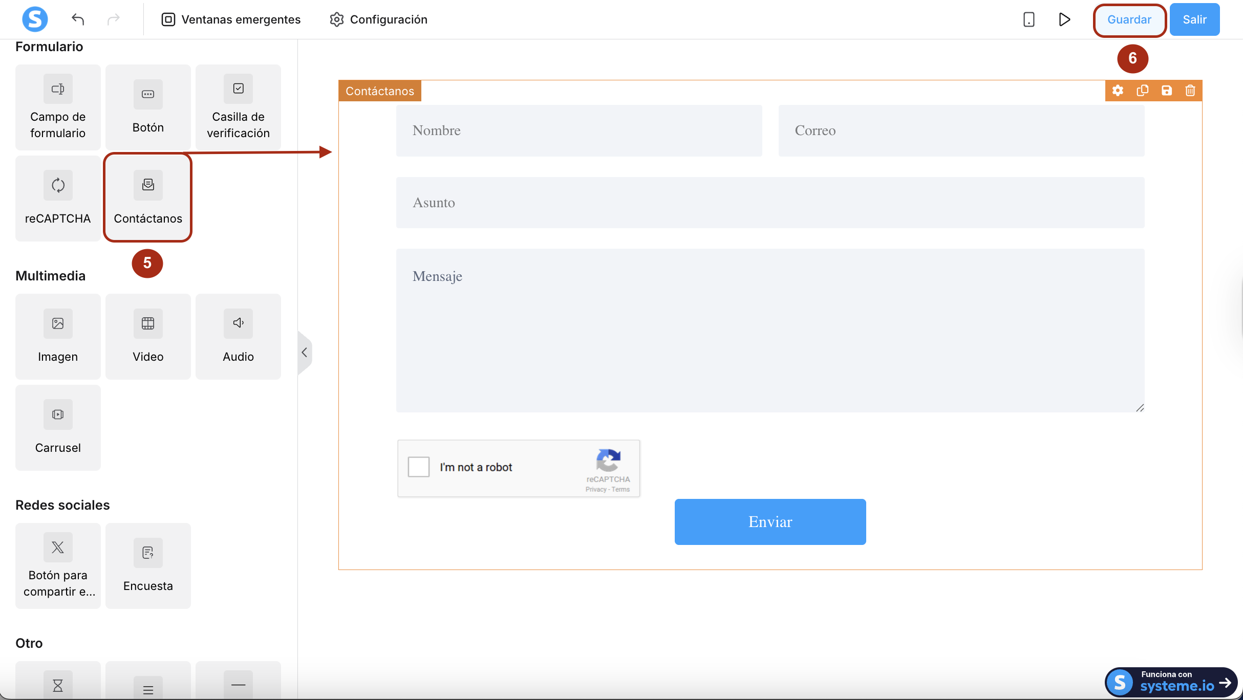 - Desde el panel izquierdo de elementos, arrastra el elemento Contáctanos y suéltalo a donde te gustaría que apareciera el formulario (5)