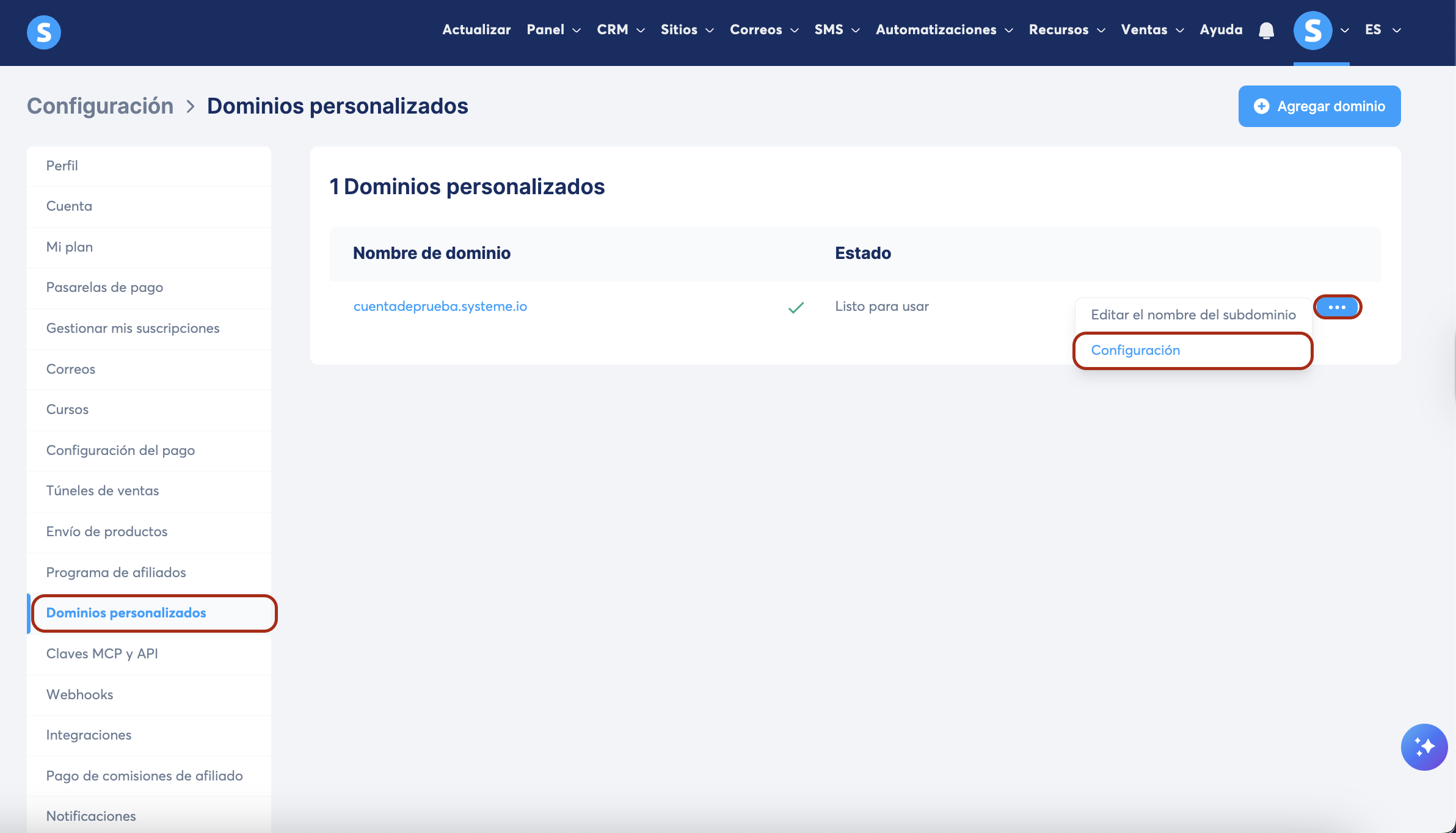 - Luego, haz clic en el menú de tres puntos a la derecha de tu dominio y selecciona Configuración