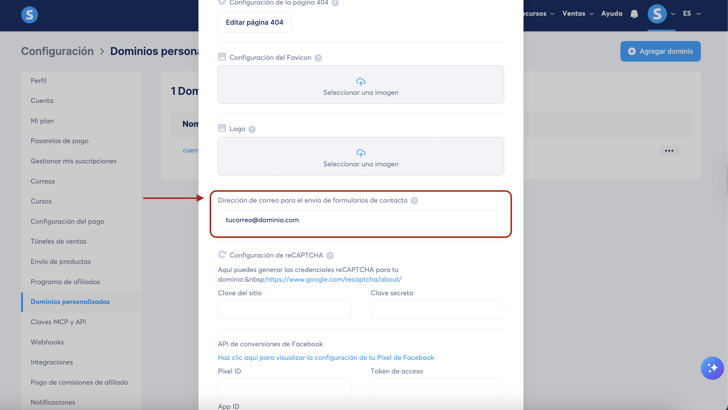 Aparecerá la ventana emergente Configuración de dominio. En esta ventana, desplázate a Dirección de correo para el envío de formularios de contacto e ingresa el correo electrónico a donde deseas recibir estos mensajes.