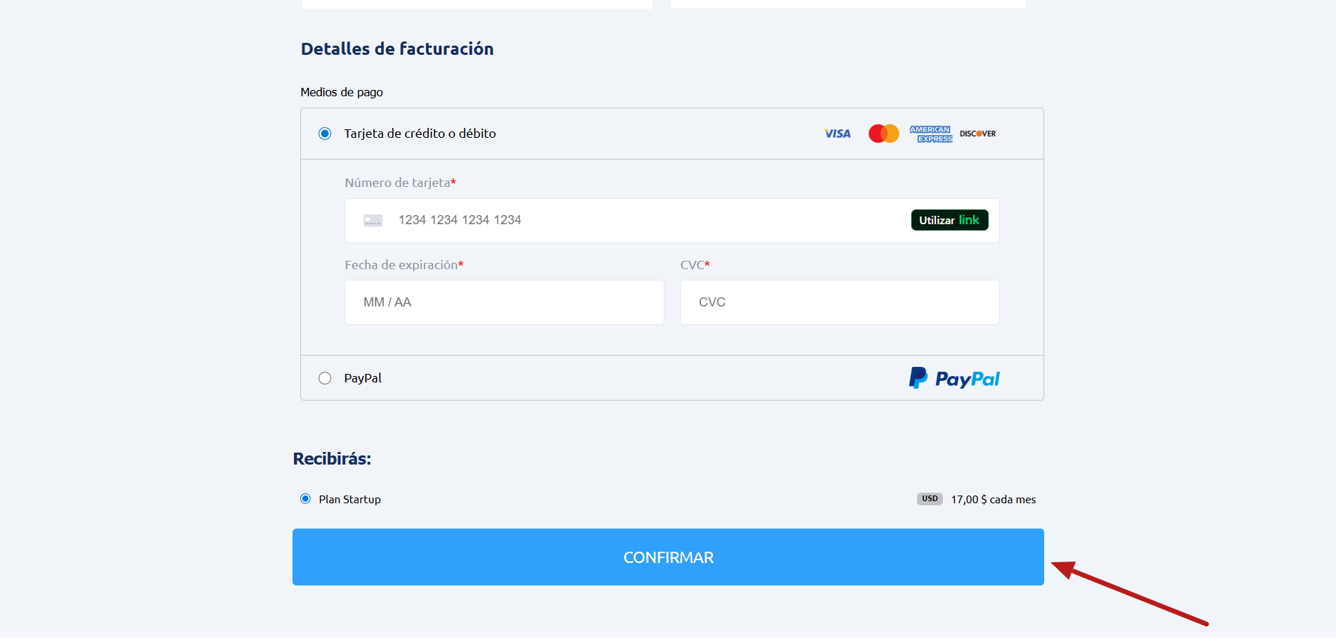 Luego completa la página de pago y haz clic en "Confirmar", para validar la compra: