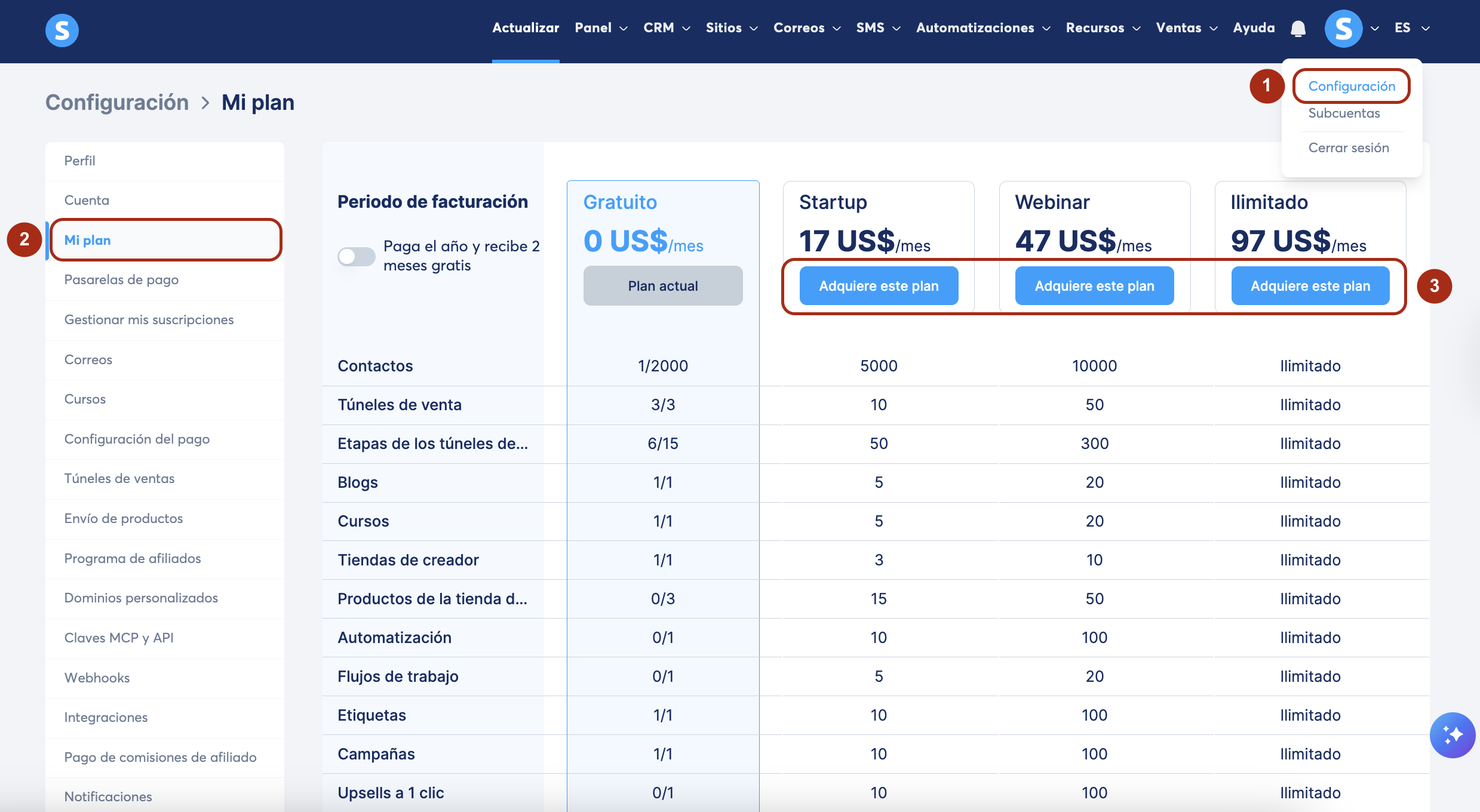 Puedes comprar o actualizar tu suscripción de systeme.io directamente desde tu cuenta haciendo clic en Configuración (1).