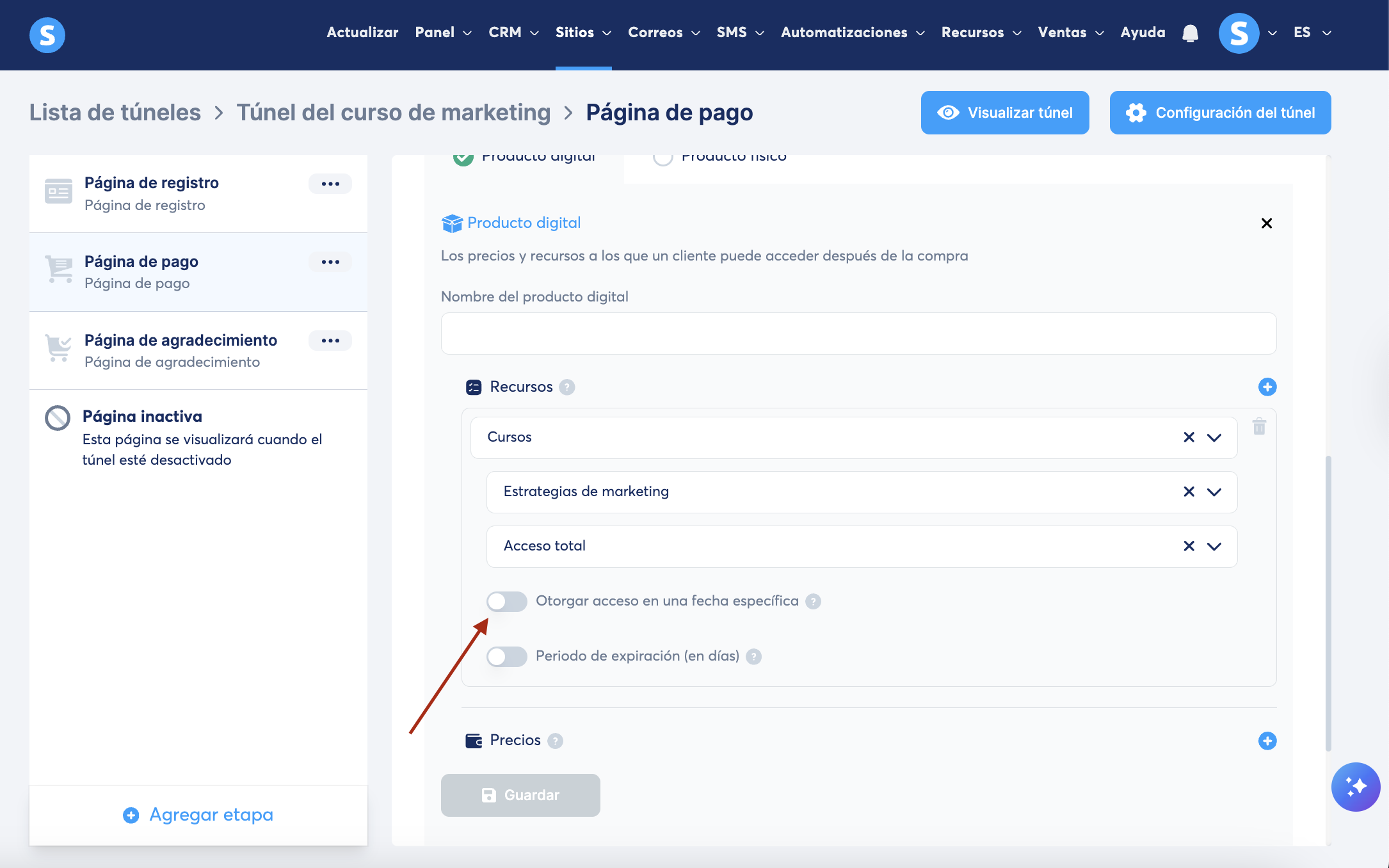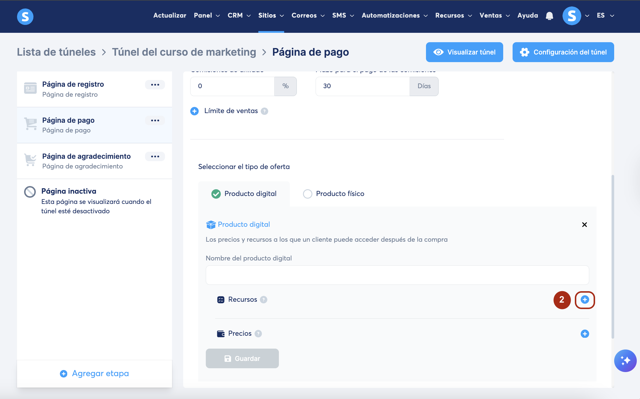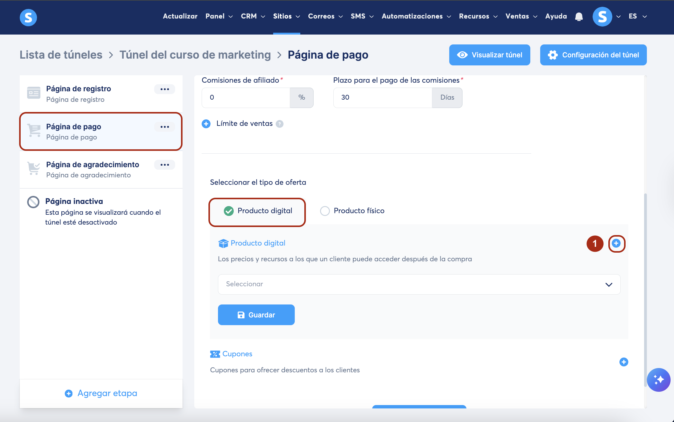 1. Ve a la página de pago del túnel de ventas que vas a usar para vender tu curso y selecciona como tipo de oferta Producto digital (1)