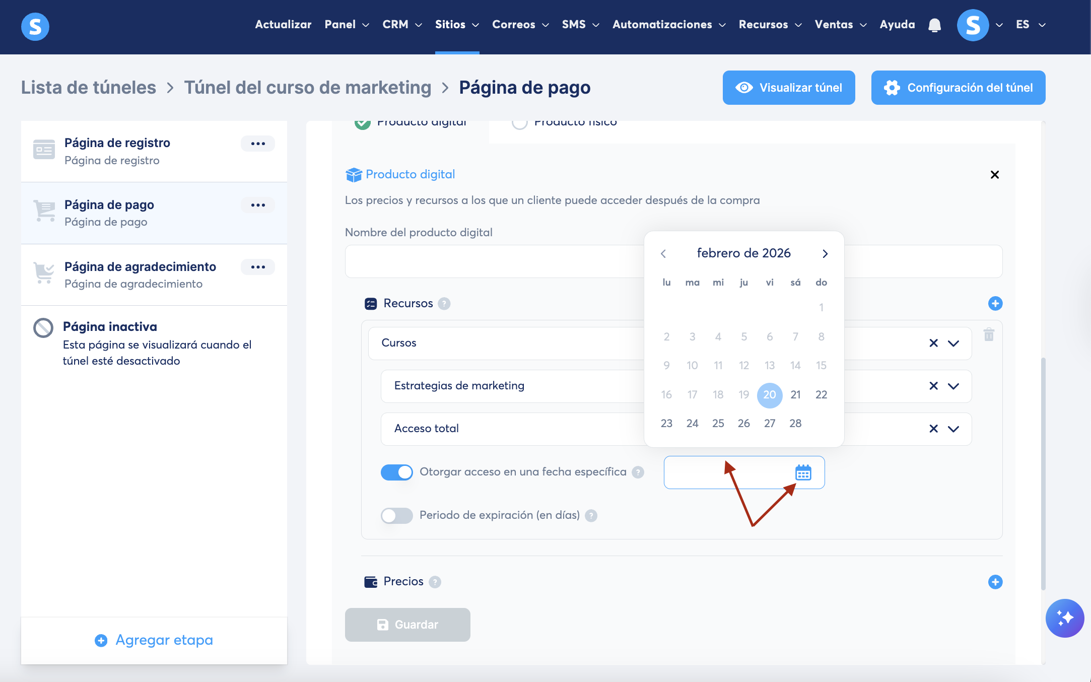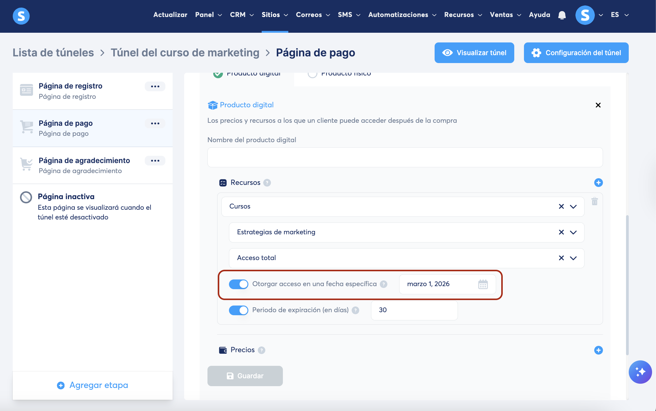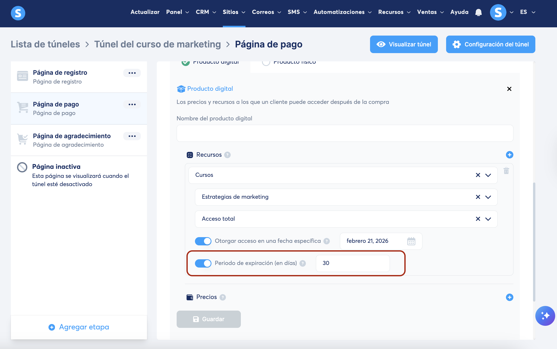 En la página de pago del túnel de ventas que estamos usando para vender nuestro curso, seleccionamos la configuración de los recursos y establecemos los siguientes valores: