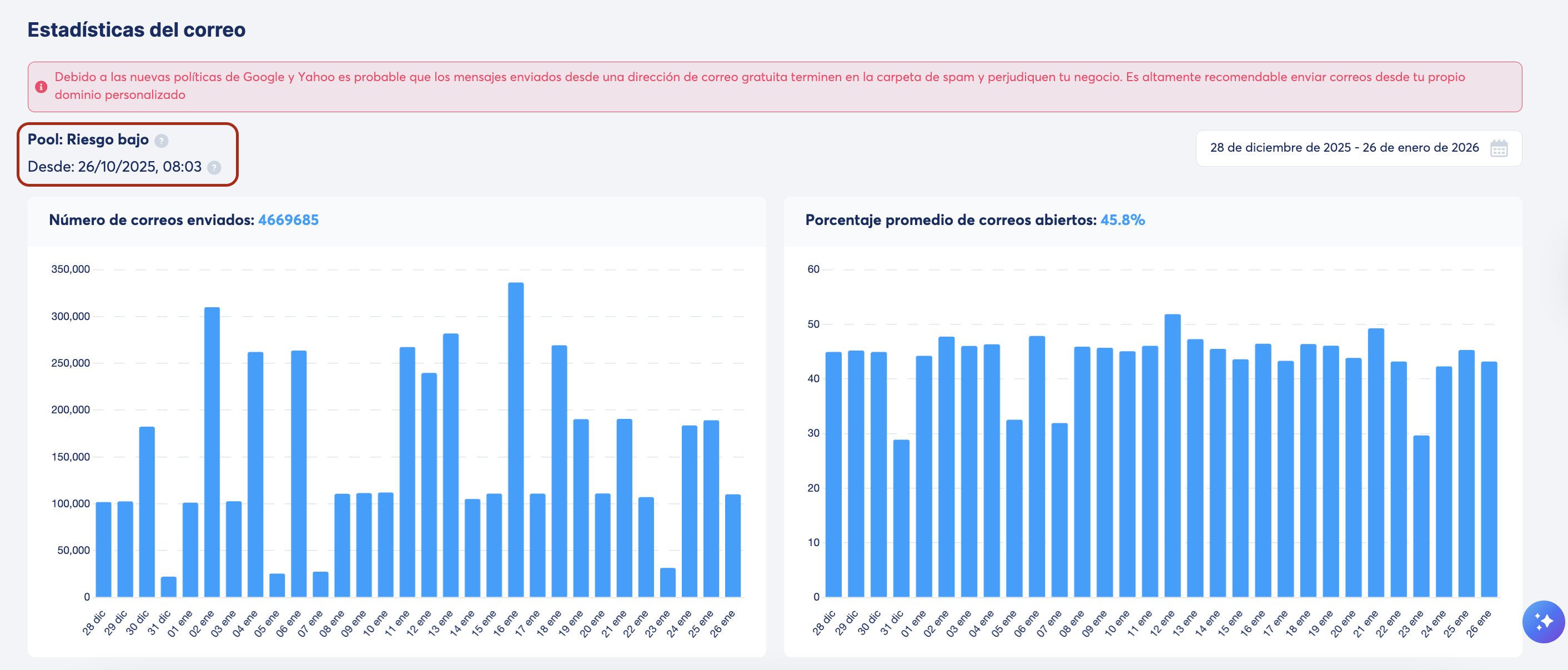 Nota: revisamos los correos enviados desde la fecha del cambio a la última pool y hasta 5 días antes. Necesitamos estos 5 días para recolectar las estadísticas de entrega del correo, tales como: