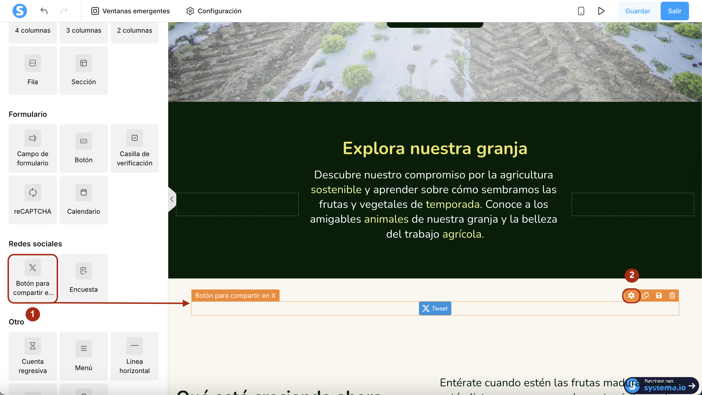 En el editor de página, arrastra el elemento Botón para compartir en X (1) desde el panel izquierdo y suéltalo en tu página. Haz clic en el ícono de configuración (2) para ver sus opciones.