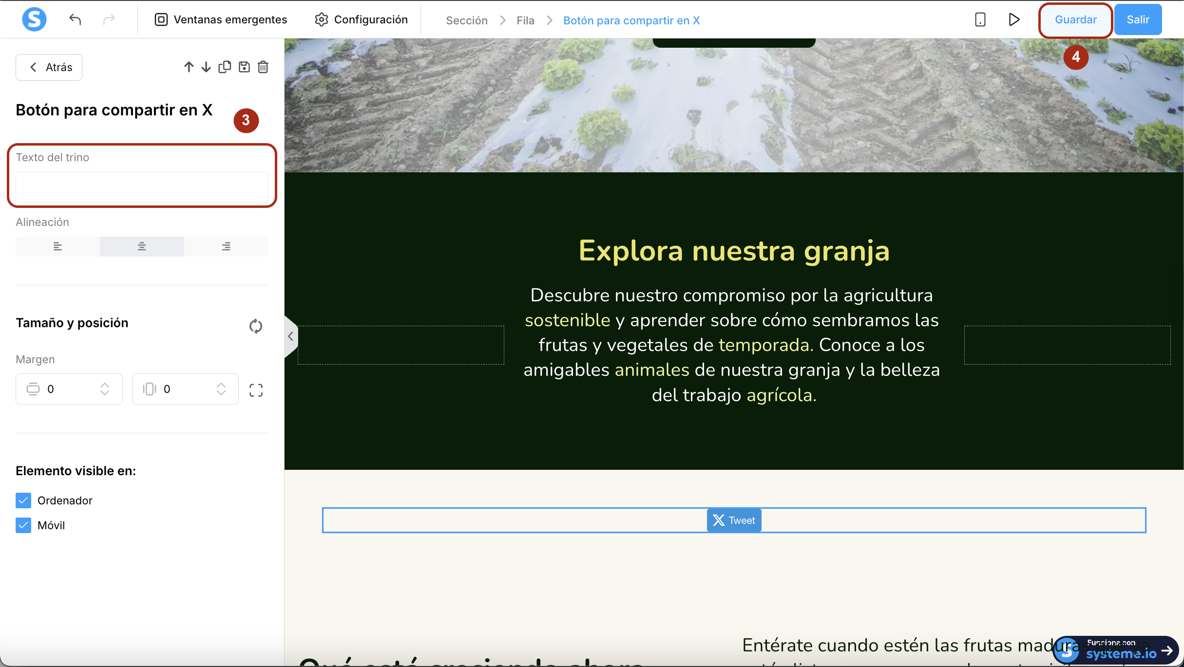 Agrega el texto del trino (3), luego haz clic en Guardar (4) para guardar tu página. Una vez guardes los cambios, la versión anterior de la página no se podrá restaurar.