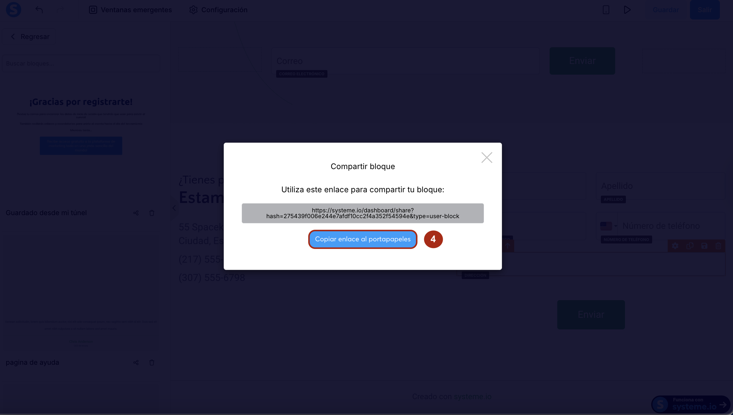 Aparecerá una ventana emergente con el enlace único del bloque. Haz clic en Copiar enlace al portapapeles (4) para copiar esta URL y compartirla con otros usuarios de systeme.io.