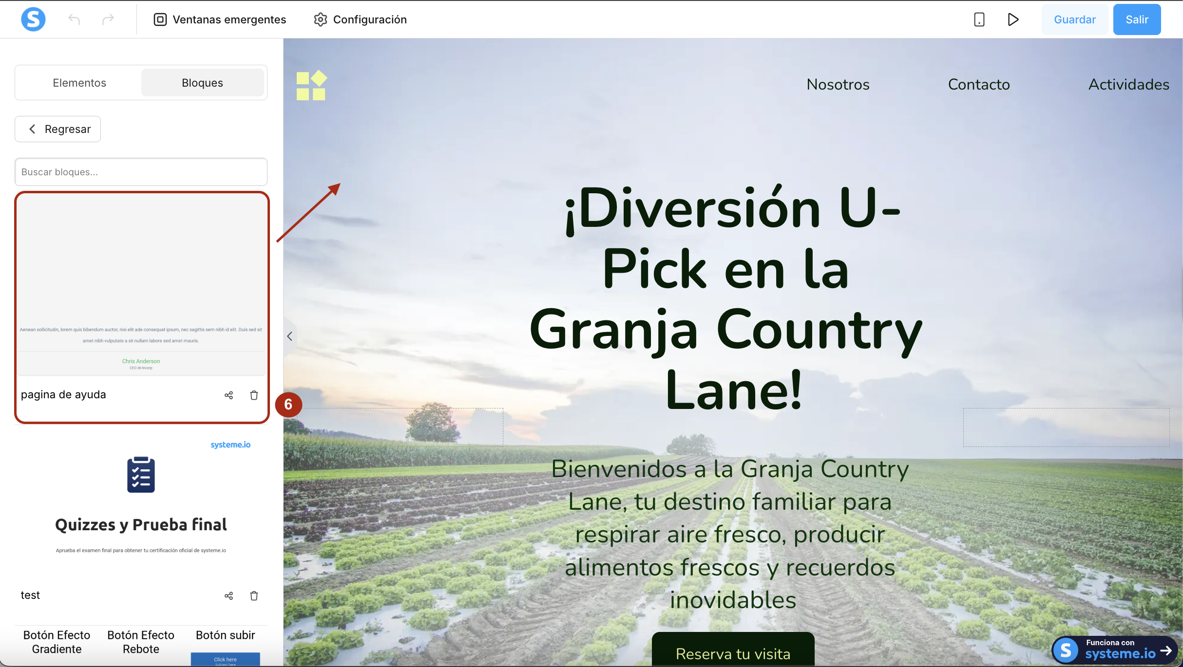 Selecciona el bloque y arrástralo y suéltalo en tu página (6).