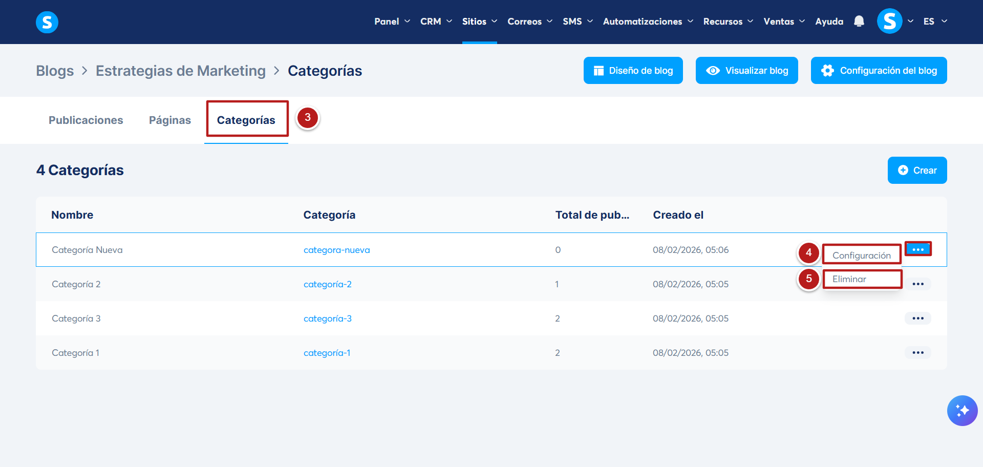 Para eliminar una categoría, haz clic en Eliminar (5).
