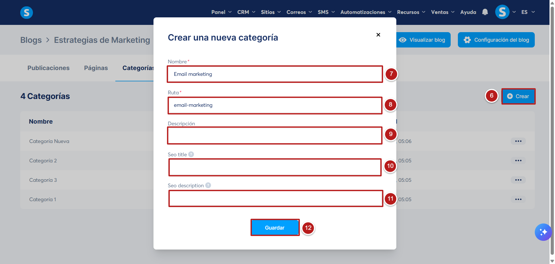 - Guardar (12): Haz clic en este botón para guardar y crear la nueva categoría.