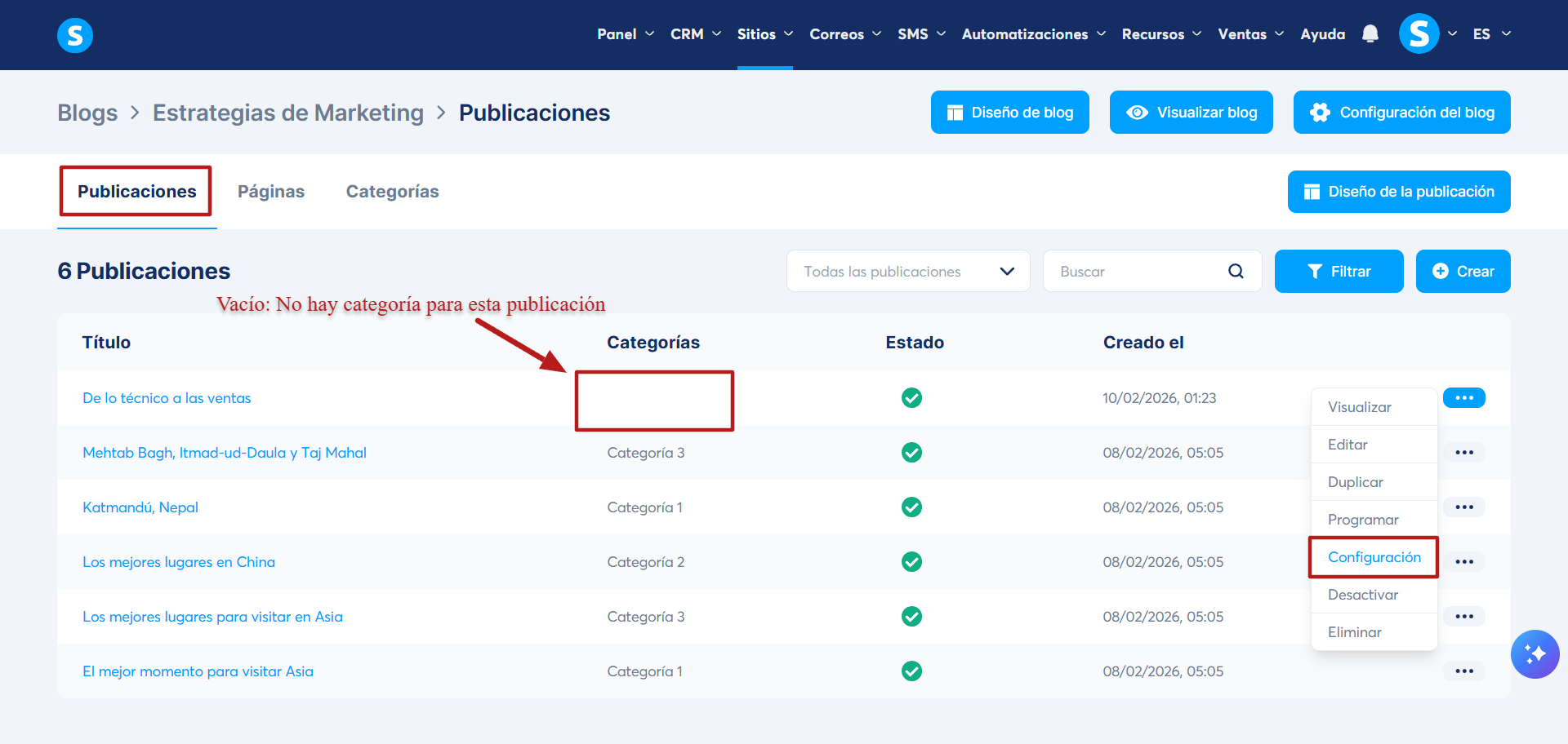 Desde el menú de tu blog, ve a la sección Categorías (3) para mostrar todas las categorías.