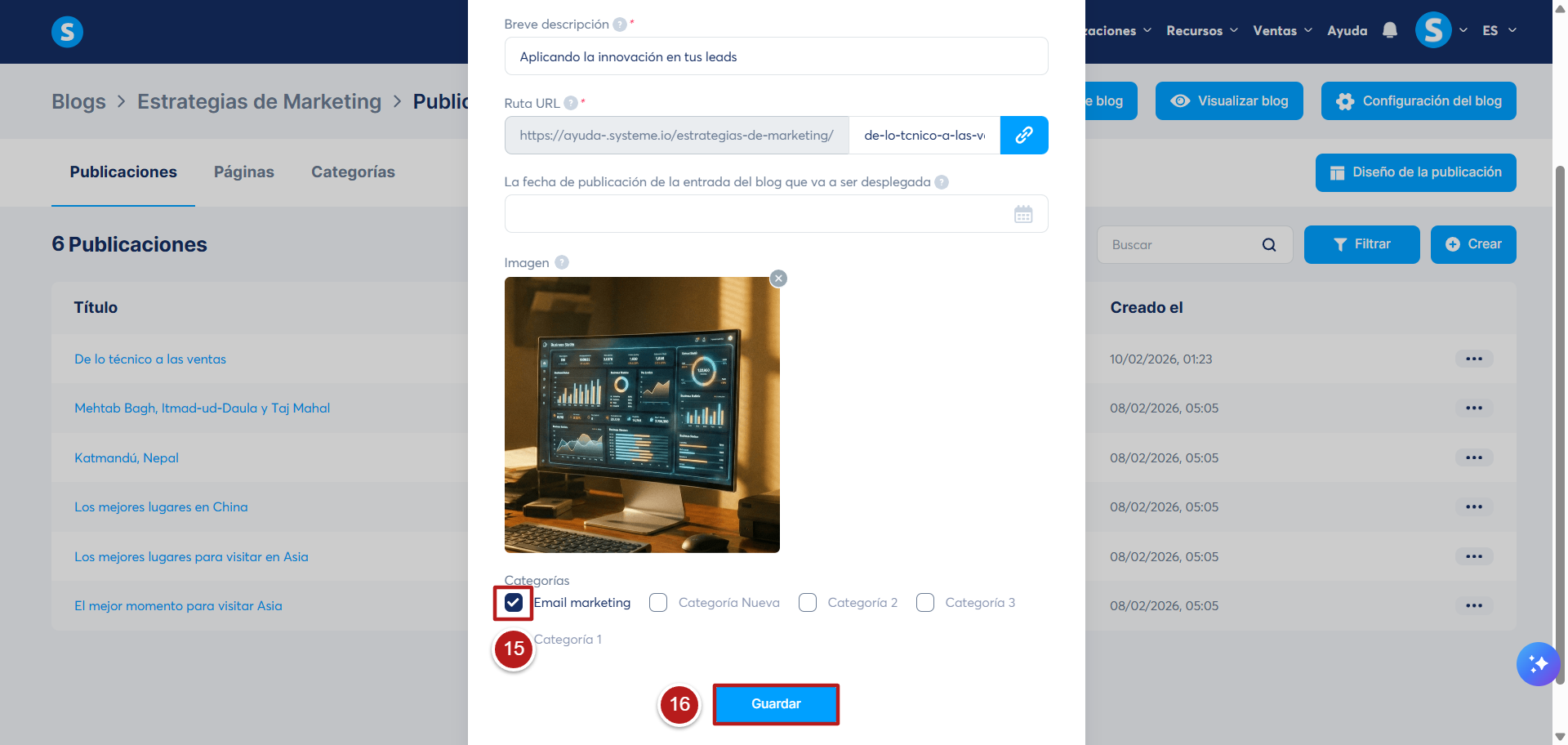 En la configuración de tu publicación, selecciona la casilla de la categoría que deseas añadir (15), luego haz clic en "Guardar" para guardar los cambios (16).